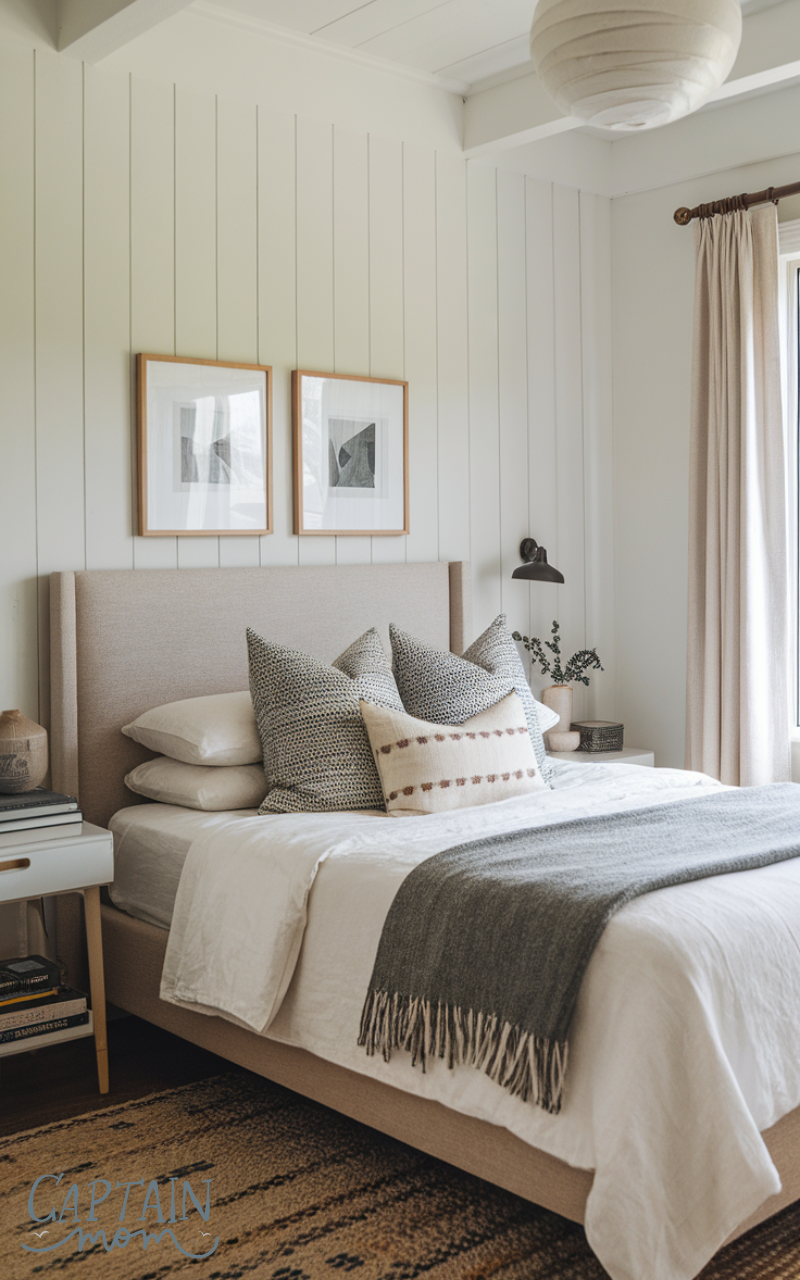 A slim headboard is essential among layout tips for a tiny bedroom with a queen bed because bulky designs take up unnecessary space. A low-profile or wall-mounted headboard keeps the room feeling open while still providing comfort and style. Light-colored or upholstered options add warmth without overwhelming the space. You can even opt for a painted or panelled wall as a headboard alternative.