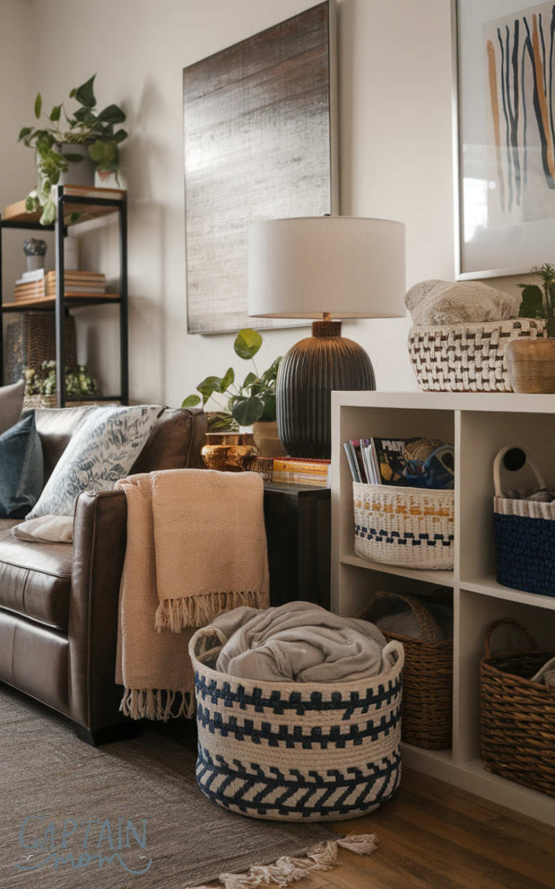 Decorative baskets are an easy and flexible solution for a living room with no closet storage. They can be placed under tables, next to sofas, or on shelves to store throws, magazines, or toys. Baskets add texture and warmth while keeping items neatly contained. This simple idea helps a living room with no closet storage stay tidy and visually appealing.