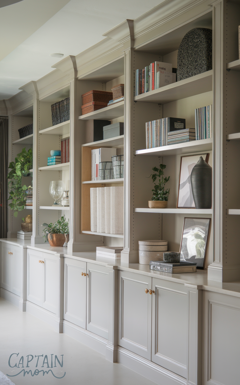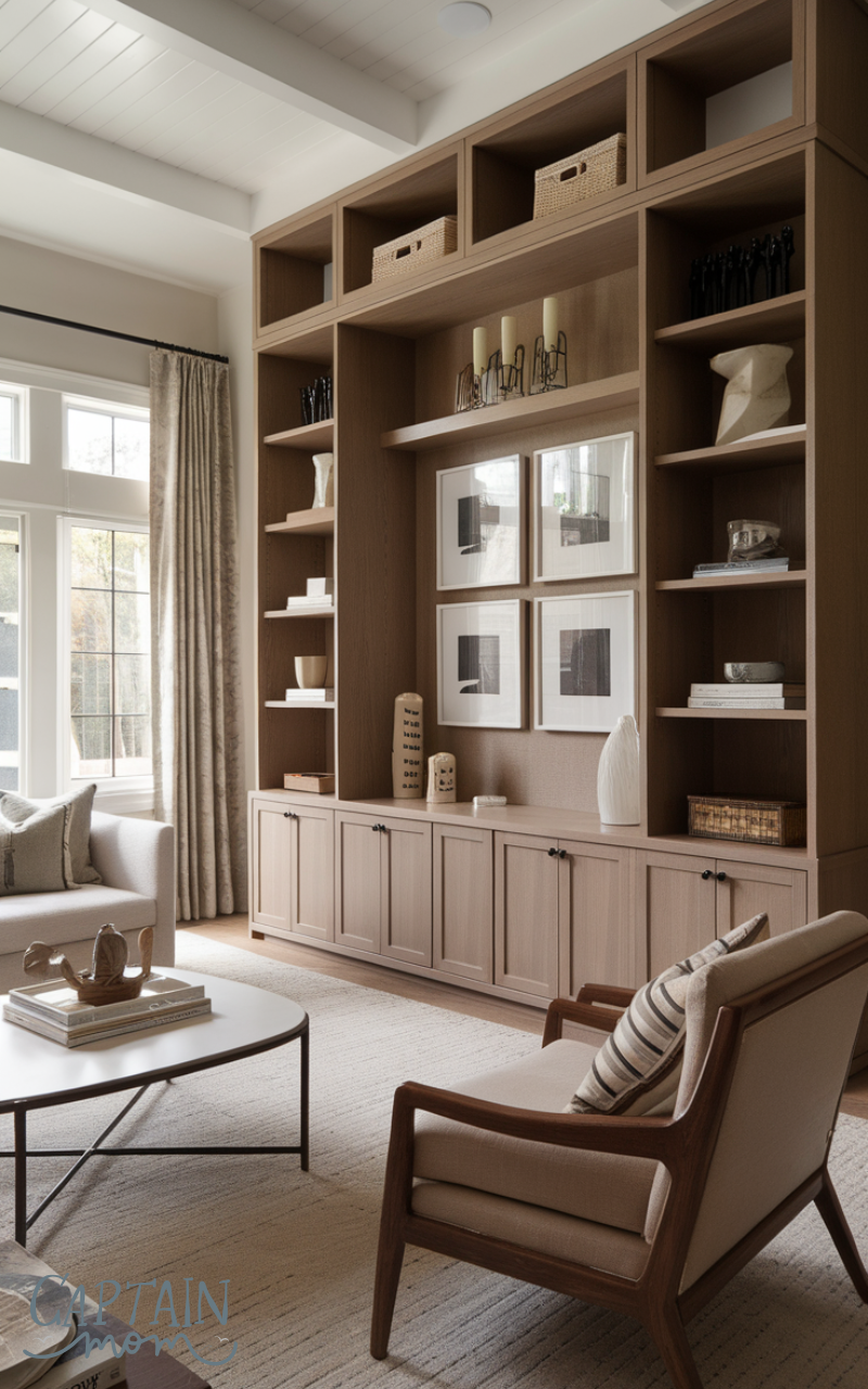 A built-in wall shelving system is one of the smartest ways to organize a living room with no closet storage. These shelves use vertical space efficiently while keeping the floor clear and open. You can store books, decorative boxes, plants, and personal items without clutter. Built-ins also give the room a custom, high-end look. By mixing open shelves with closed cabinets, your living room with no closet storage stays both functional and visually balanced.