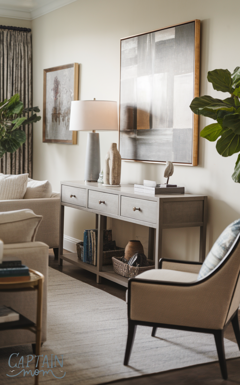 A console table with drawers works beautifully in a living room with no closet storage. Placed behind a sofa or along a wall, it offers discreet storage for small essentials like keys, chargers, and papers. The surface can be styled with lamps or décor, making it both practical and attractive. In a living room with no closet storage, hidden drawers help reduce visible clutter effortlessly.