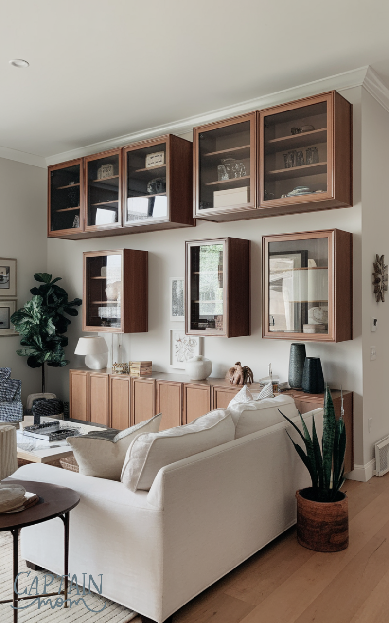 Floating cabinets are perfect for a living room with no closet storage because they add storage without feeling heavy. Mounted on the wall, they create space underneath, making the room look larger and more open. You can store electronics, documents, or seasonal items neatly out of sight. This solution keeps your living room with no closet storage organized while maintaining a modern, airy style.