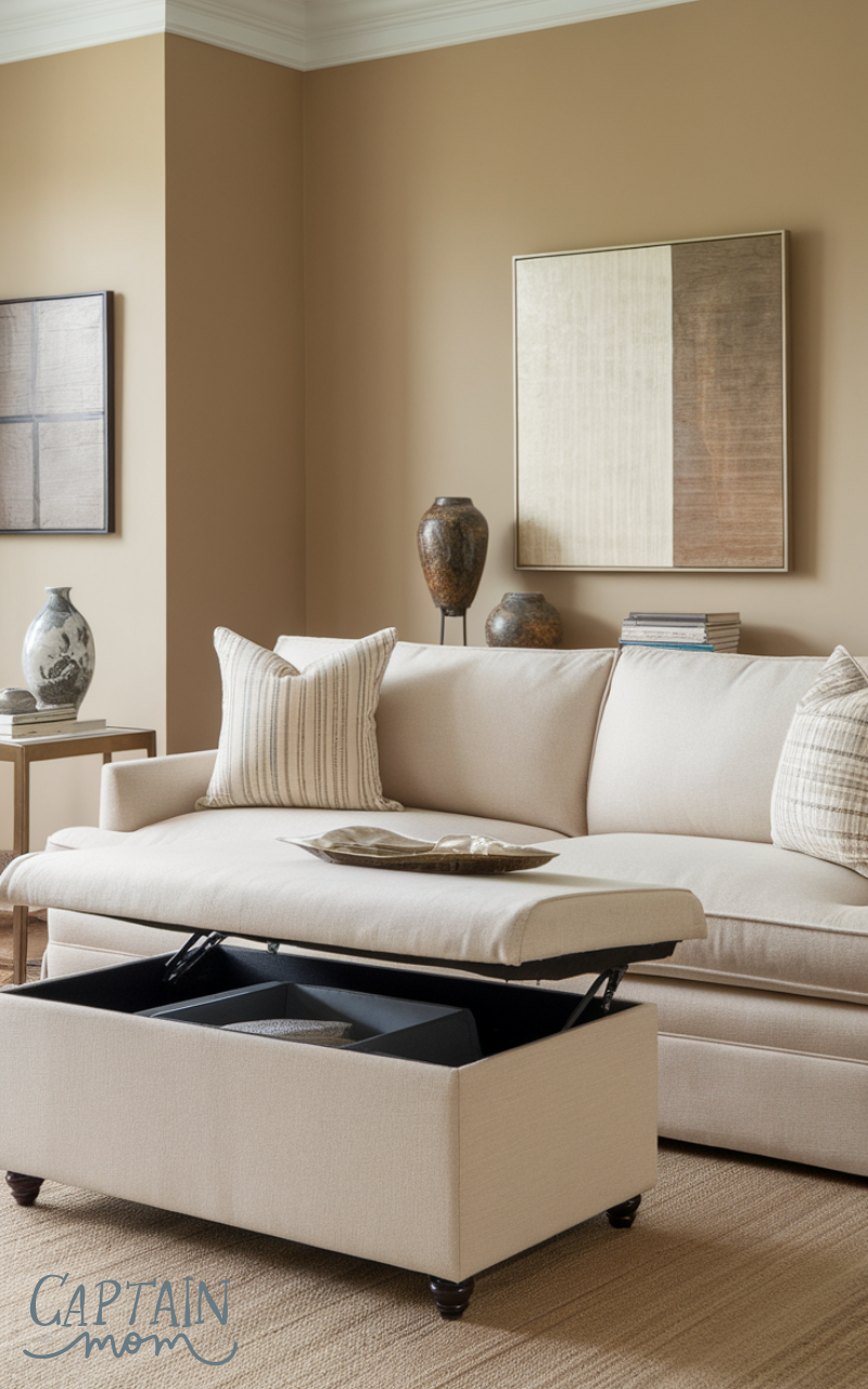 Storage ottomans are a lifesaver in a living room with no closet storage. They provide a comfortable place to rest your feet while hiding blankets, magazines, or kids’ toys inside. This idea keeps everyday items close without making the room feel messy. Choose an ottoman that matches your décor for a seamless look. In a living room with no closet storage, furniture that multitasks is always a smart move.