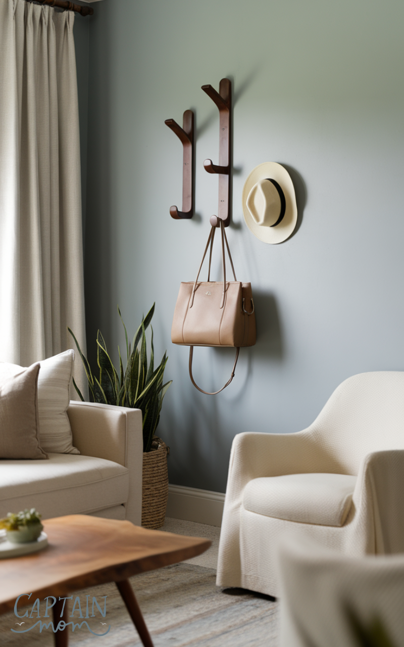 Stylish wall hooks can add practical storage to a living room with no closet storage. They are great for hanging bags, hats, or light jackets without taking up floor space. Choose decorative hooks that match your interior design. This small addition can make a big difference in a living room with no closet storage.