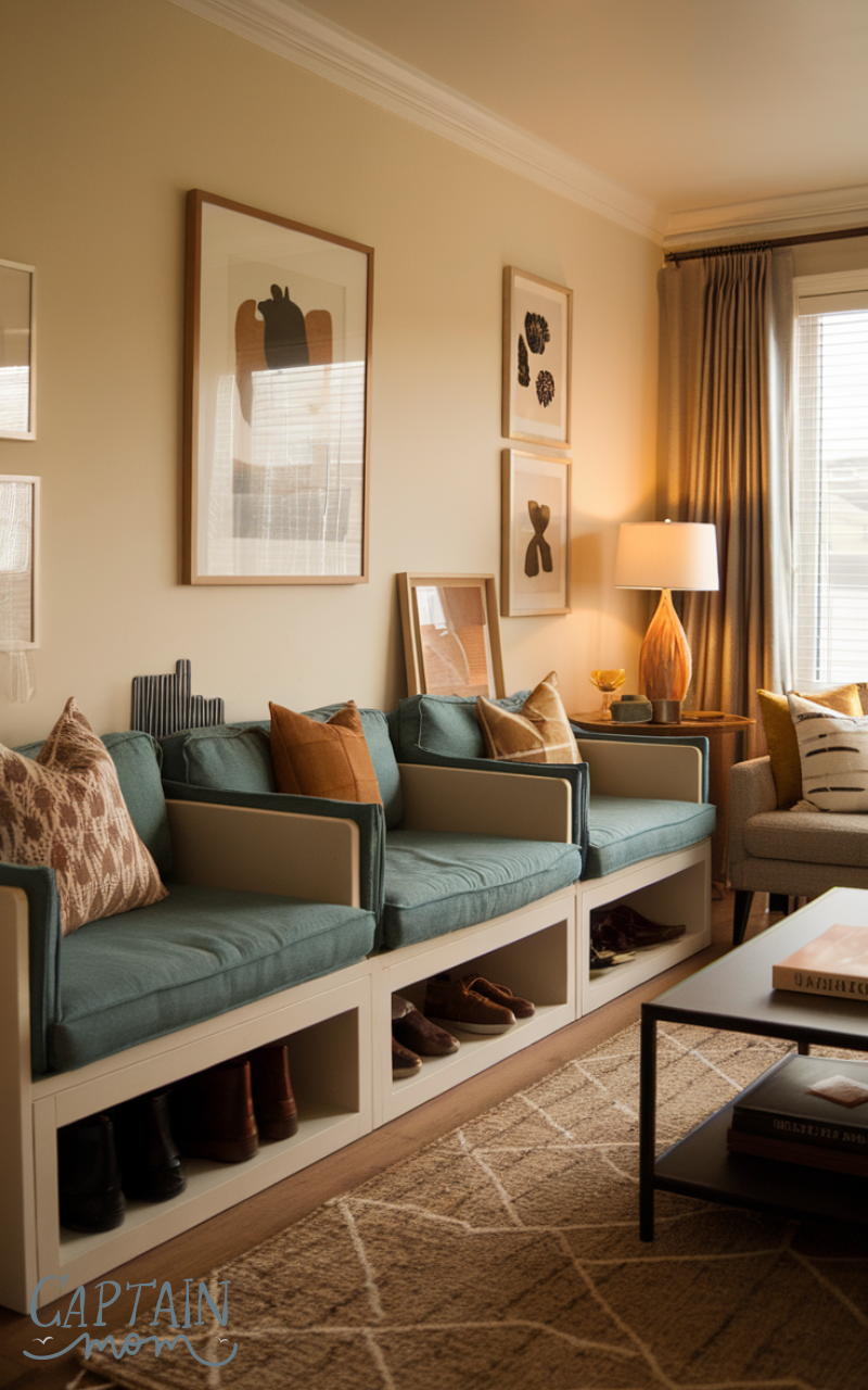 Storage benches placed along a wall are perfect for a living room with no closet storage. They provide seating while offering space inside for shoes, bags, or extra cushions. This is especially useful in small apartments. A living room with no closet storage benefits greatly from seating that also serves as storage.