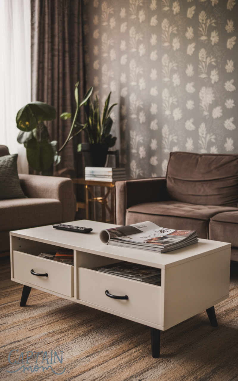 A coffee table with built-in storage is ideal for a living room with no closet storage. Drawers or lift-top designs allow you to store remotes, magazines, and everyday items out of sight. This keeps the tabletop clear and organized. In a living room with no closet storage, choosing furniture with hidden storage makes daily life easier.
