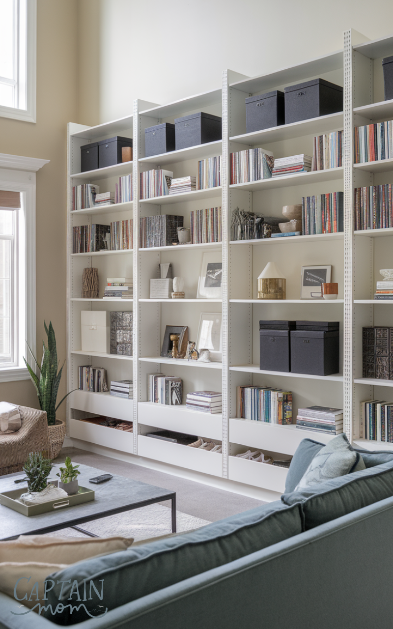 Tall bookcases can act as a storage wall in a living room with no closet storage. They offer plenty of room for books, boxes, and decorative pieces while drawing the eye upward. Using matching storage boxes on lower shelves keeps things looking neat. This makes a living room with no closet storage feel intentional rather than improvised.