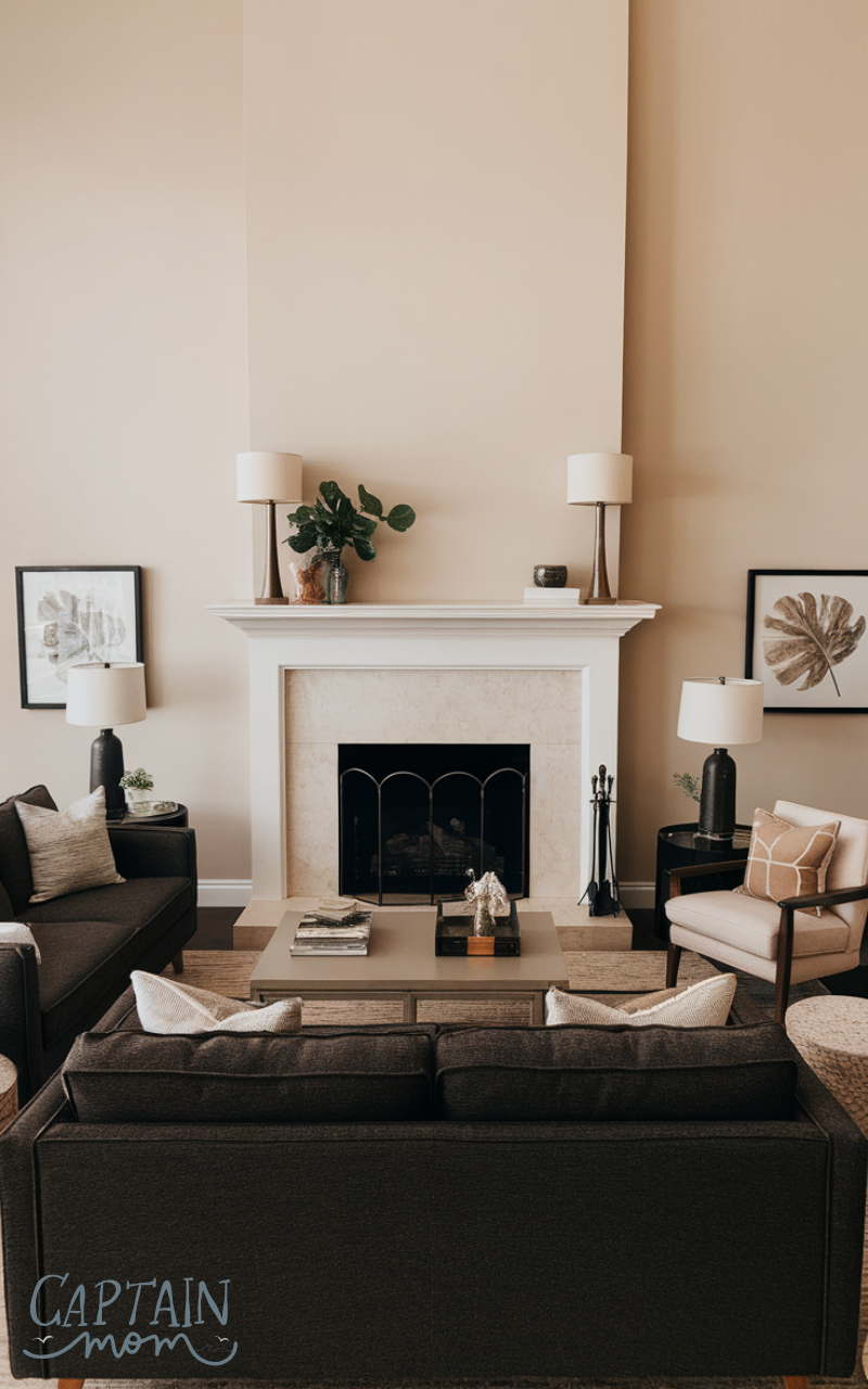When you have a fireplace, let it guide your Square Living Room Layout. Position seating evenly around it, keeping the layout balanced on both sides. This creates a natural focal point and makes the room feel warm and welcoming. In square rooms, centering furniture around the fireplace helps avoid awkward corners and unused space. Finish the look with symmetrical decor for a polished and timeless feel.