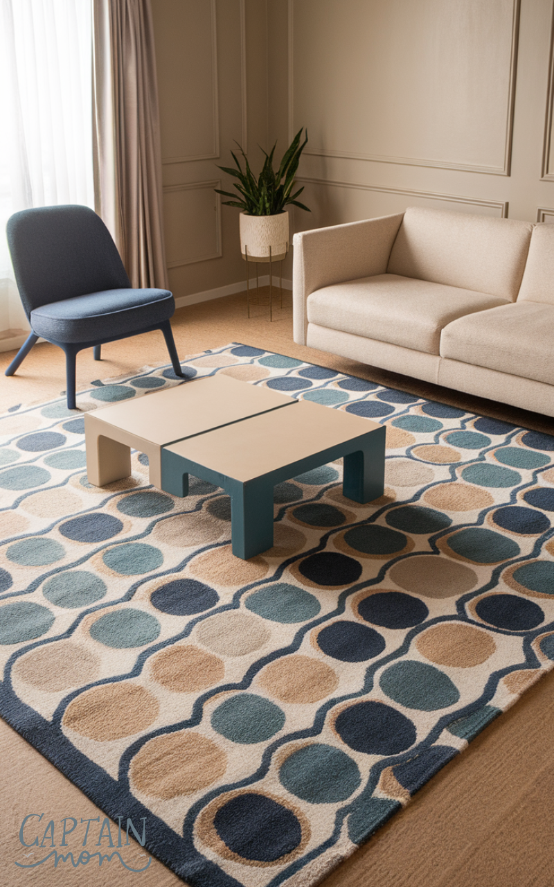 A rug can define your entire Square Living Room Layout. Place all main furniture legs on a large square or round rug to visually anchor the space. This technique brings cohesion and warmth, especially in open or echo-prone rooms. The rug helps connect furniture pieces and emphasizes the room’s shape in a stylish, intentional way.