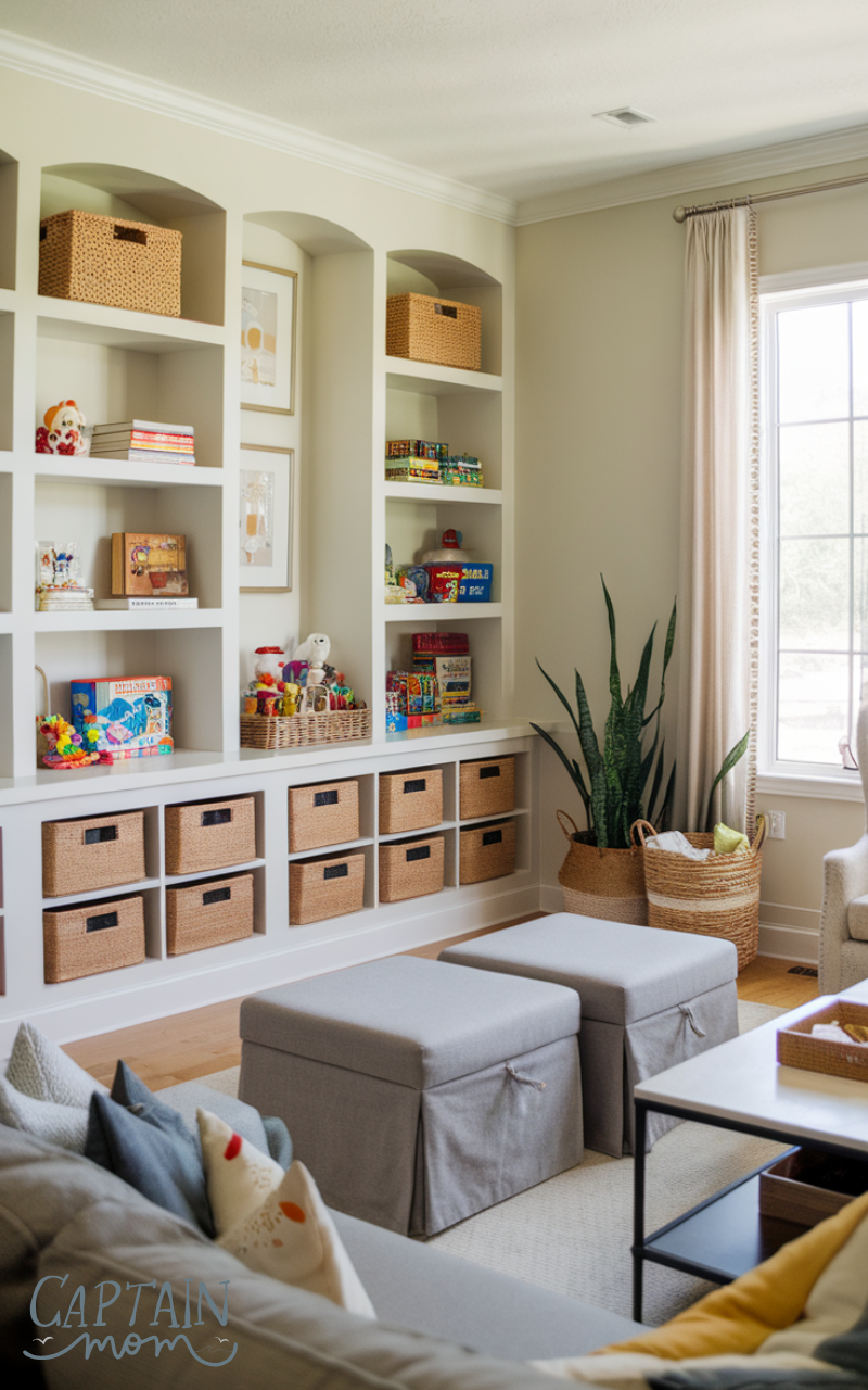 Storage is key in a family friendly living room. Built-in shelves, storage ottomans, and baskets help keep toys, books, and games organized. When everything has a place, the room stays tidy and calm. Smart storage makes daily life easier and helps your family friendly living room feel functional without looking cluttered.