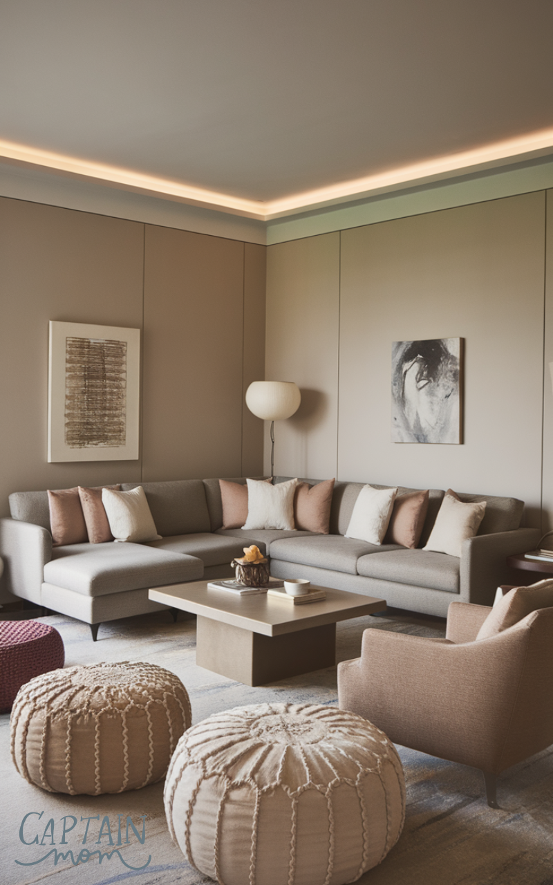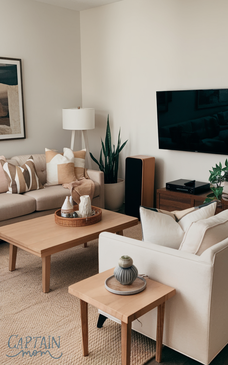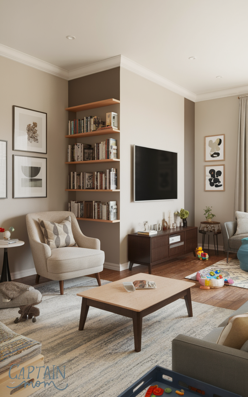 A neutral base keeps a family friendly living room calm and timeless. Beige, gray, or soft white walls provide flexibility as your family grows. Practical accent colors can be added through pillows or decor, making updates easy without redesigning the whole space.