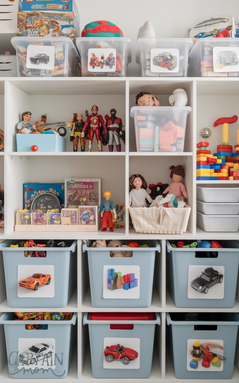 For younger children, clear labels with photos help manage clutter with toy organization. Even non-readers can match pictures to the bin contents, encouraging independence and quick cleanup. This visual system makes toy storage easier and keeps spaces neat without constant adult supervision.