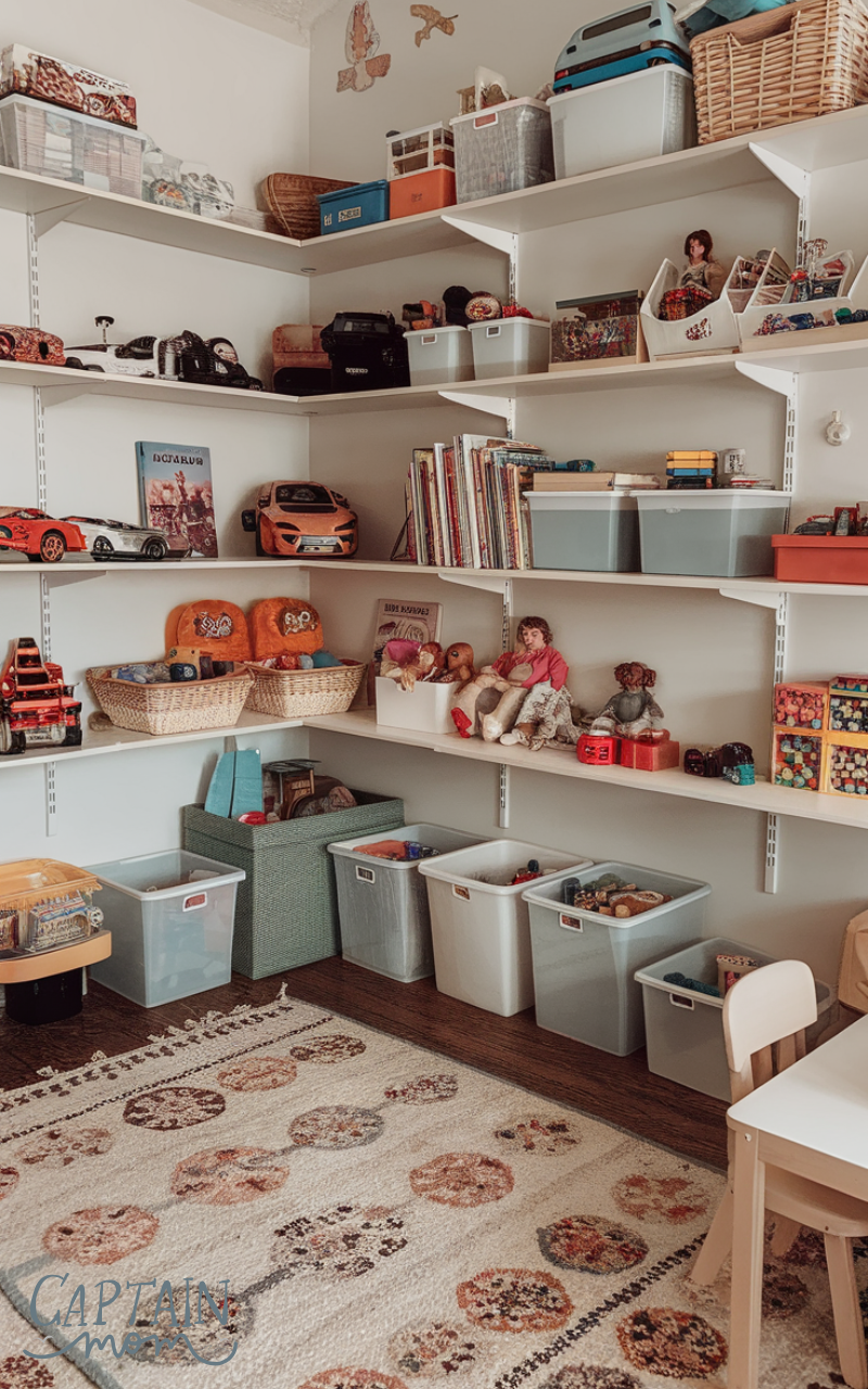Open shelving is great for keeping toys visible and accessible while minimizing clutter. Baskets or bins can sit on shelves, creating a structured look. This setup encourages kids to put toys back after playtime, making clutter with toy organization easier to manage. Open shelving also doubles as display space for favorite toys and books, blending storage with decor.