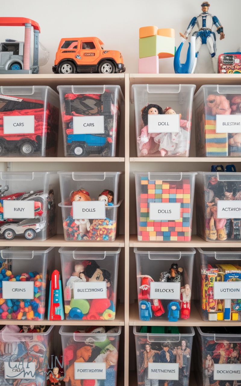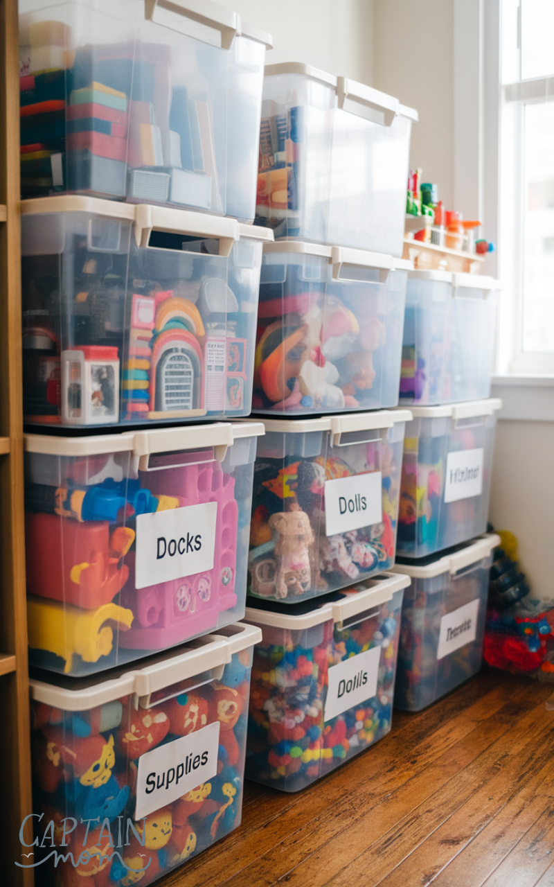 Clear storage bins are a simple way to reduce clutter with toy organization. Kids and adults can easily see what’s inside, which helps with cleanup and finding toys. Labeling bins for categories like blocks, dolls, or art supplies adds structure. Using stackable clear bins keeps floors clear and makes your home feel more spacious while making toy organization effortless.