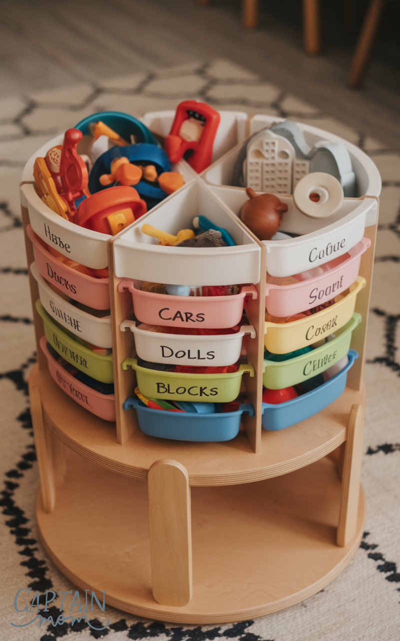 Rotating baskets or lazy susan bins can simplify toy cleanup. Kids can spin the basket to find toys or put them away quickly, making clutter with toy organization more engaging. This is especially helpful for small spaces or shared play areas, keeping toys in order without extra effort.