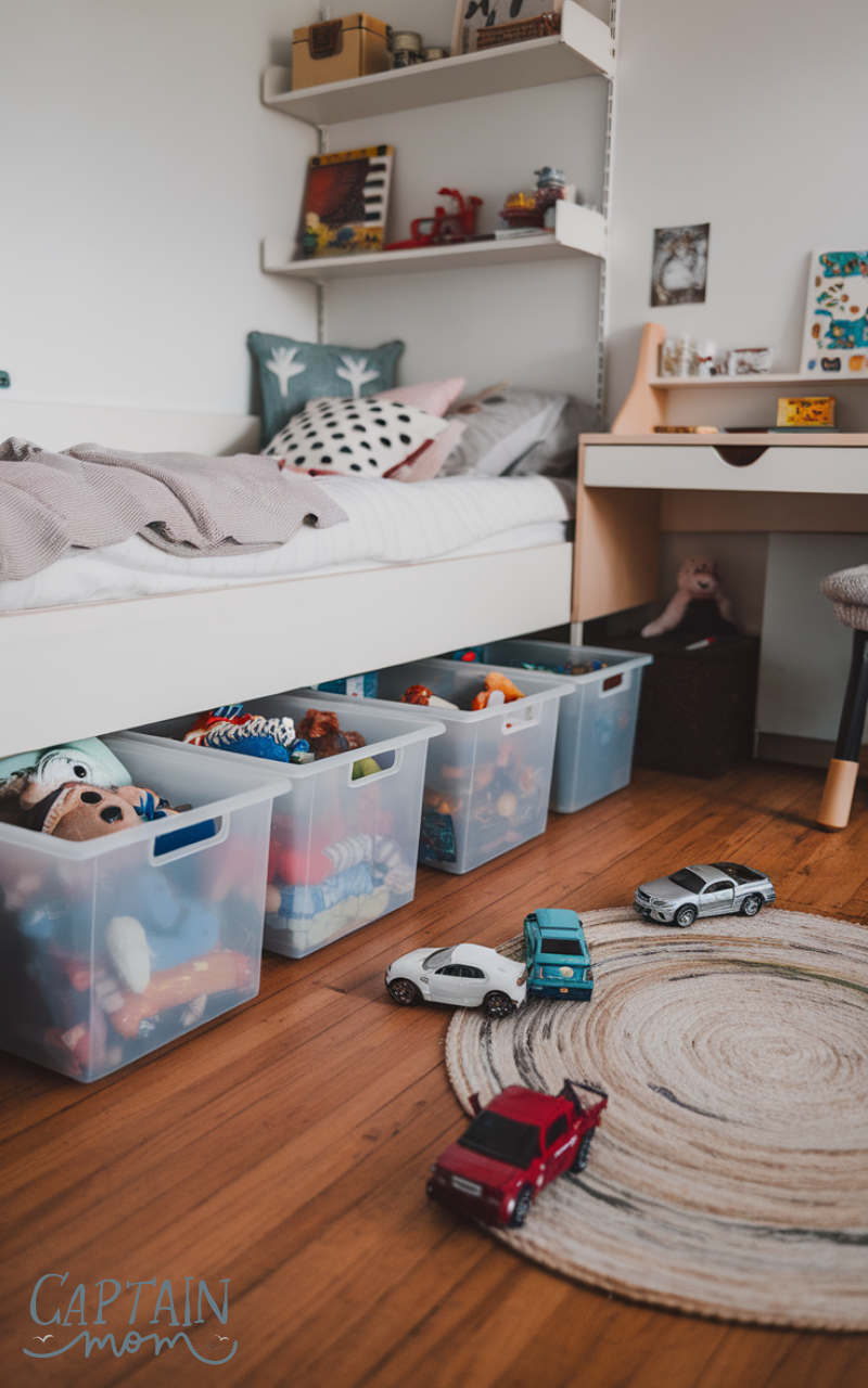 Using under-bed storage is a clever way to manage clutter with toy organization. Low-profile bins or rolling drawers can hold toys that aren’t needed every day. This keeps toys out of sight but still easy to reach, maintaining a tidy and organized space without compromising accessibility.