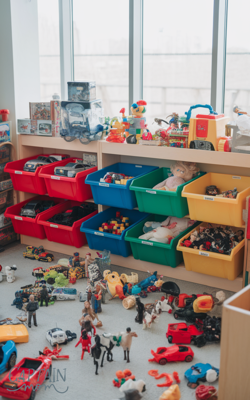 Color-coded bins make clutter with toy organization intuitive for kids. Assign a color to a type of toy (e.g., red for cars, blue for building blocks). This makes cleanup a fun game and helps younger children sort their own toys, creating a more self-sufficient play environment.