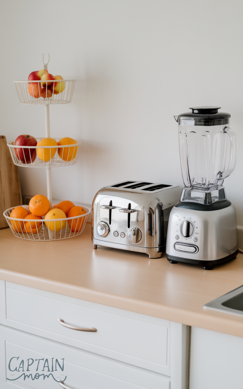 Small appliances can easily overwhelm a counter. One of the best habits for keeping a kitchen counter without clutter is storing blenders, mixers, and air fryers in cabinets when not in use. This instantly creates more space and visual calm.