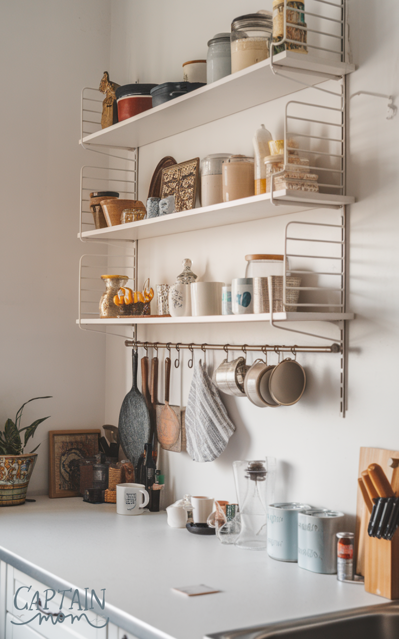 Using vertical space helps a lot with keeping a kitchen counter without clutter. Wall shelves can hold jars, mugs, or decor while freeing up valuable counter space. This keeps essentials accessible without crowding the work surface.