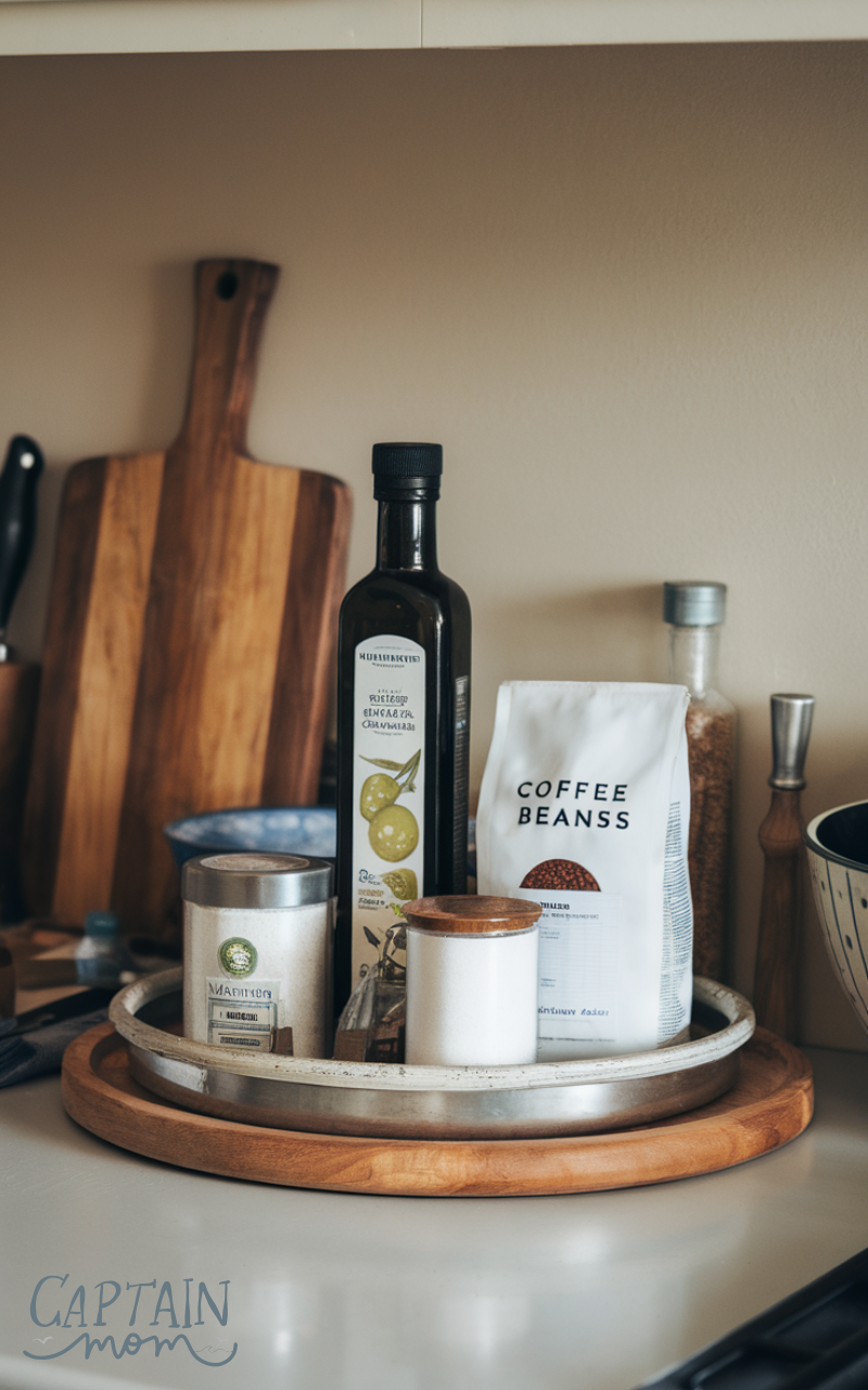 Grouping items on a tray is a smart way of keeping a kitchen counter without clutter. A tray visually organizes oils, salt, or coffee supplies, making the counter look intentional instead of messy. It also makes cleaning faster since you can move everything at once.