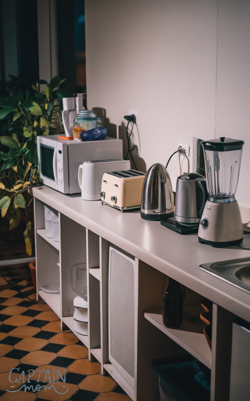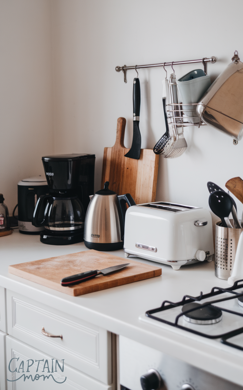 For keeping a kitchen counter without clutter, limit what stays out to items you use every single day. Coffee makers, kettles, or a toaster are fine if they are used often. Anything used occasionally should be stored in cabinets or drawers to maintain a clean surface.
