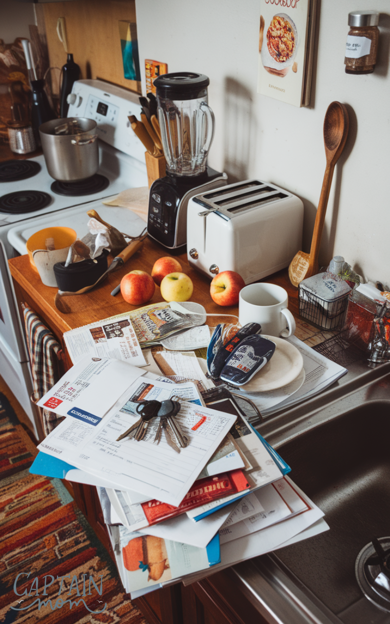 Mail, keys, and random items often end up on kitchen counters. Creating a drop zone outside the kitchen is essential for keeping a kitchen counter without clutter and preventing unrelated items from piling up.