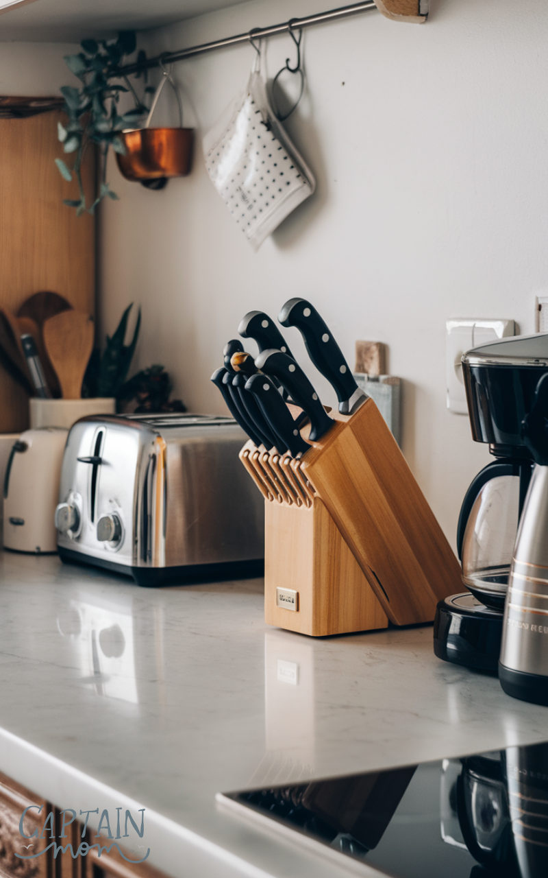If you need countertop storage, keep it minimal. A slim knife block or a small utensil holder works well for keeping a kitchen counter without clutter without sacrificing convenience or style.