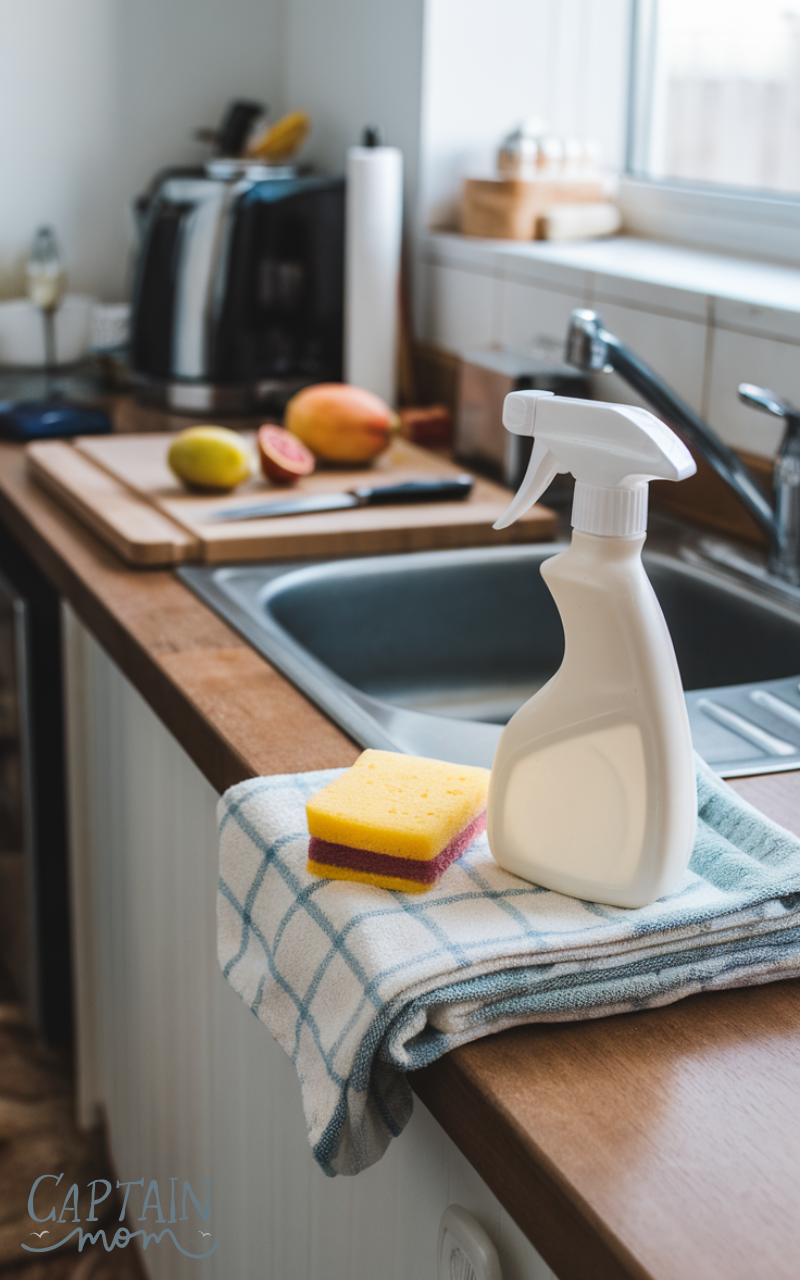 Leaving sprays and sponges on the counter creates instant clutter. A key tip for keeping a kitchen counter without clutter is storing cleaning supplies under the sink in baskets or organizers, keeping surfaces clear and hygienic.