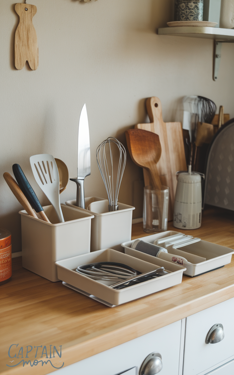 Instead of leaving utensils in containers on the counter, use drawer organizers. This method of keeping a kitchen counter without clutter hides tools neatly while keeping them easy to find, resulting in a cleaner and more minimal look.