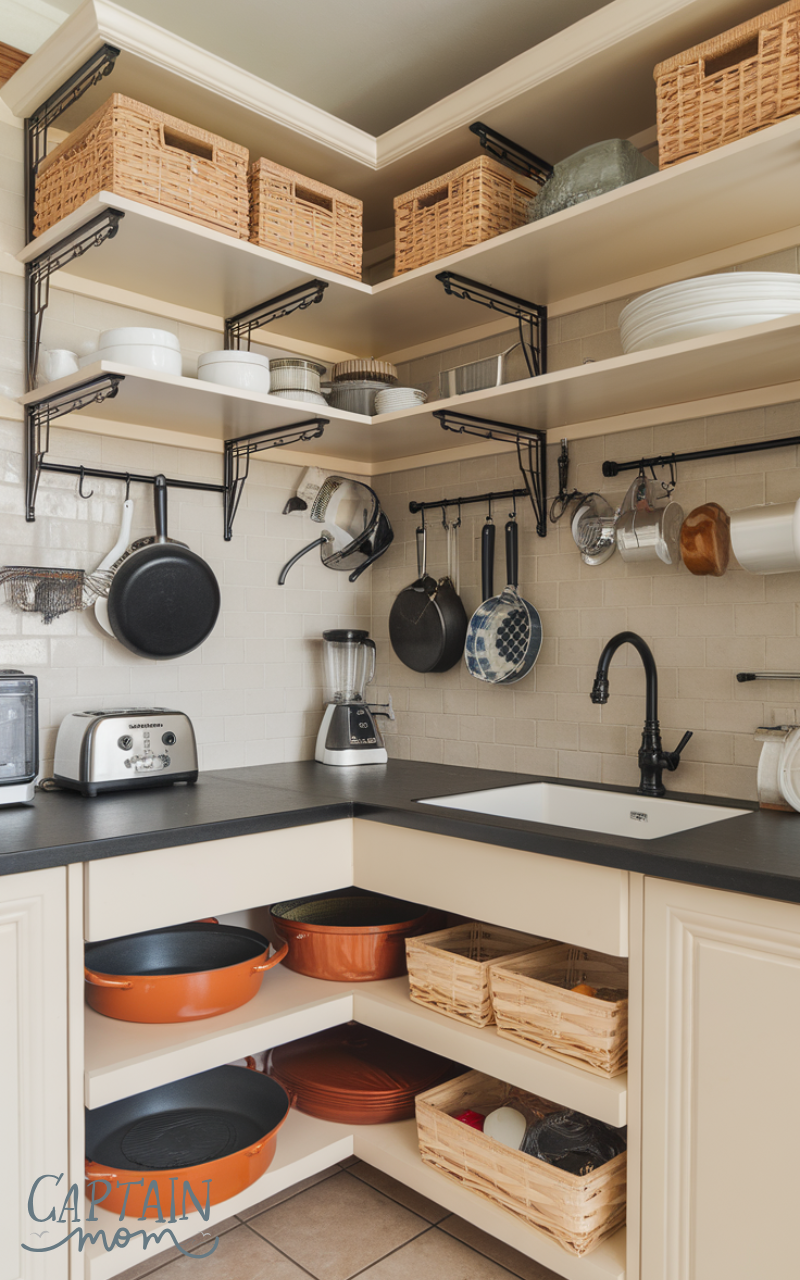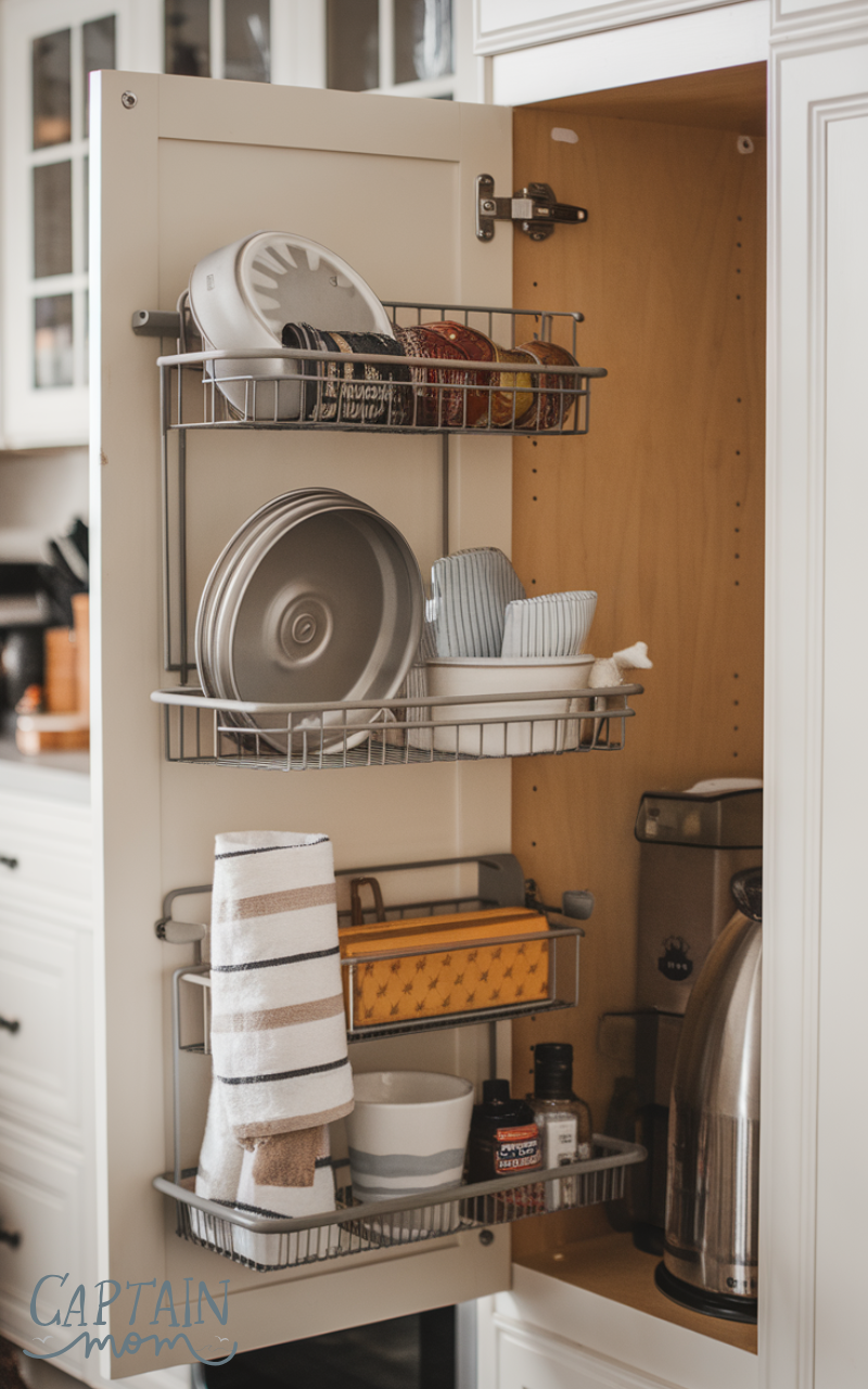 Over-the-door racks are clever kitchen storage solutions that utilize often-overlooked spaces. Installed inside pantry or cabinet doors, they are perfect for storing lids, towels, wraps, or small tools. This idea adds storage without taking up extra room.