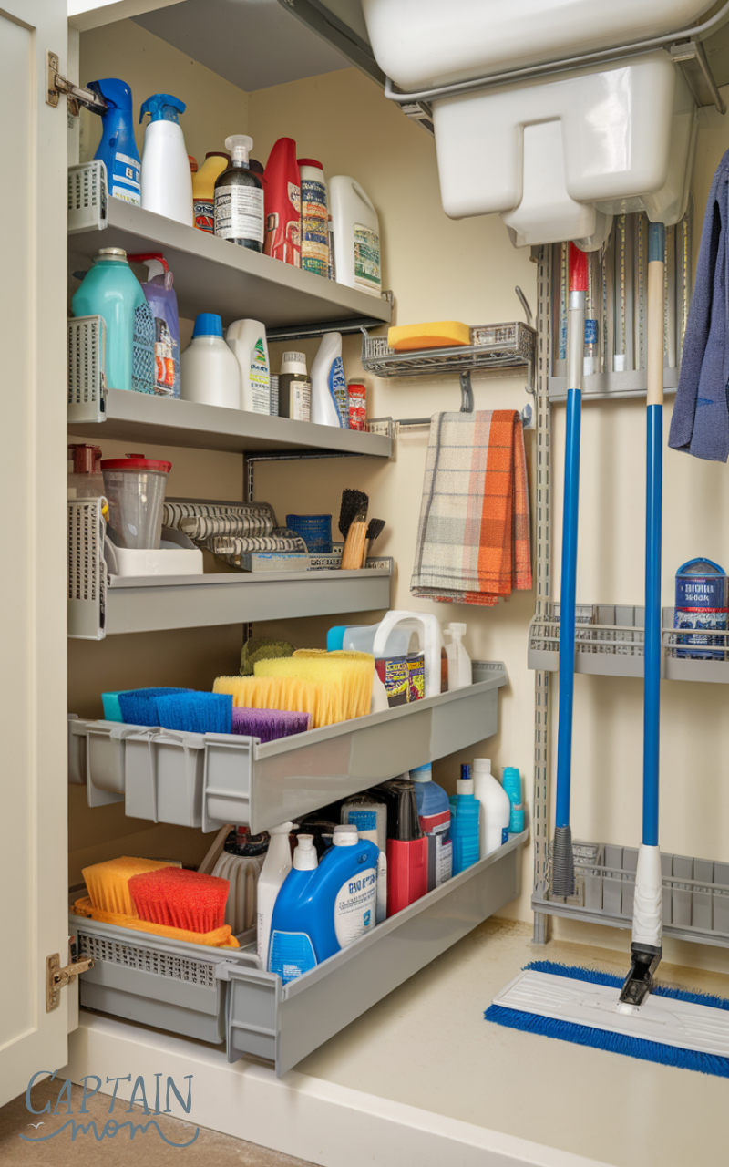 The area under the sink can become valuable kitchen storage with the right organizers. Stackable shelves, pull-out bins, or adjustable racks help keep cleaning supplies neat and accessible while avoiding clutter and spills.