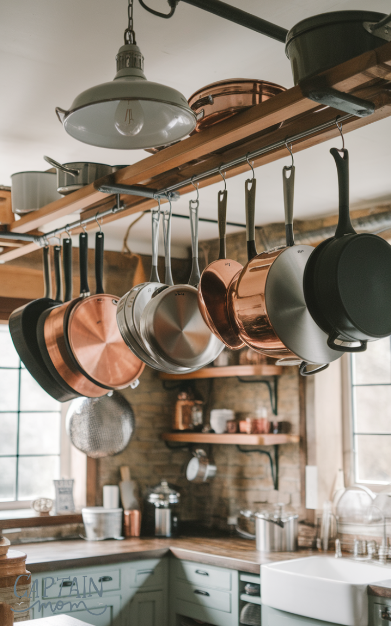 Hanging pot racks offer stylish and functional kitchen storage for frequently used cookware. By hanging pots and pans, you free up cabinet space while keeping essentials within easy reach. This solution also adds a professional, cozy feel to the kitchen.