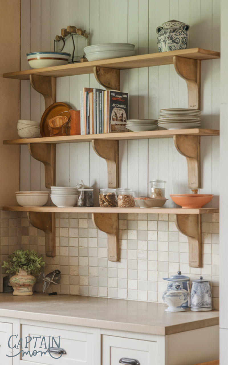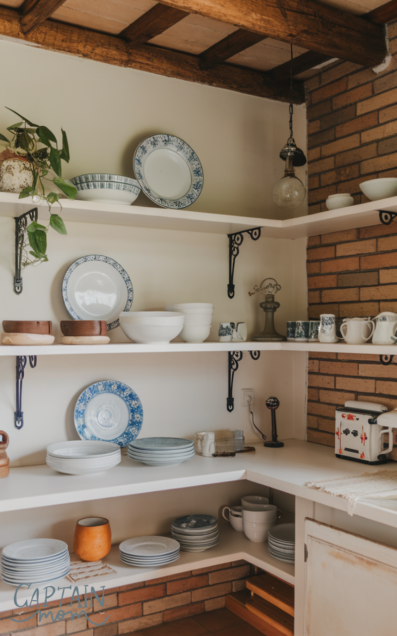 Open shelving provides practical kitchen storage for everyday essentials like plates, bowls, and mugs. It speeds up access while creating an airy, welcoming look. When styled neatly, open shelves combine function with simple elegance.