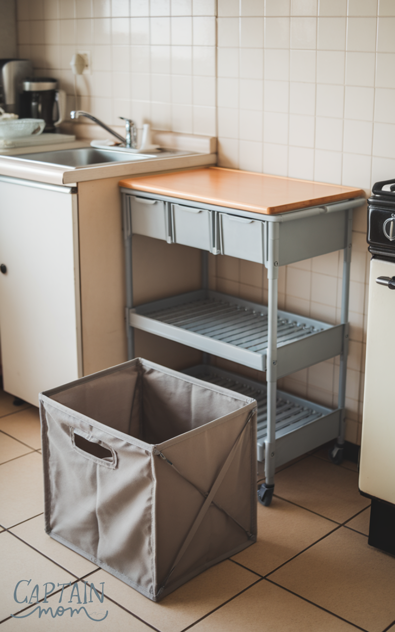 As I experimented, I realized the best Kitchen storage ideas are often temporary and flexible. A cutting board over the sink gave me instant prep space. An over-the-sink dish rack freed up cabinets. A rolling cart became my secret weapon, extra storage when I needed it, and gone when I did not. After being burned by open shelving kitchen ideas, I learned that hidden, movable storage keeps a kitchen functional without adding visual stress.