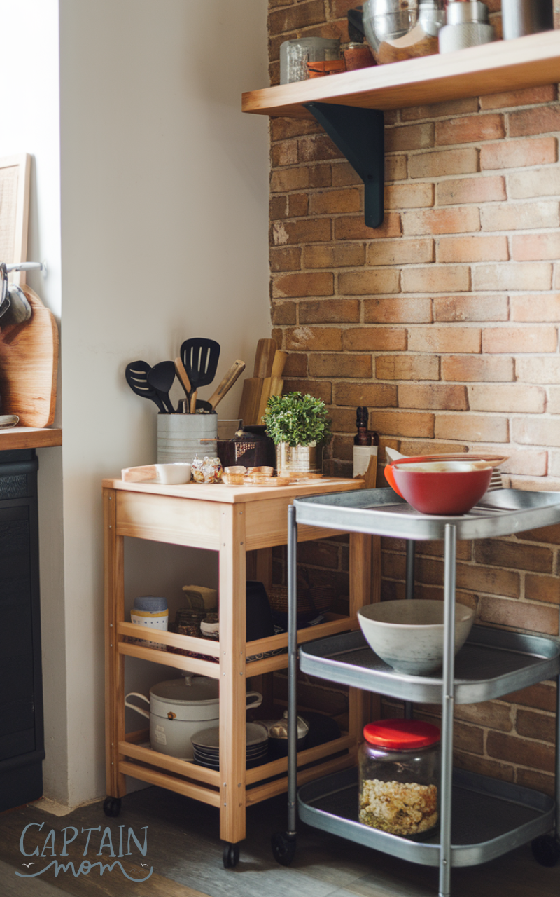 Rolling carts add flexible kitchen storage that can move wherever you need it. They work well for extra prep space, small appliances, or pantry overflow. When not in use, they can be easily rolled aside to save space.