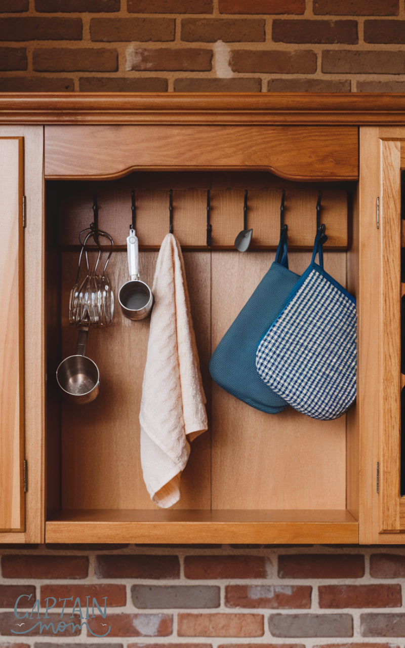 Hooks mounted inside cabinet doors are small but powerful kitchen storage solutions. They are perfect for hanging measuring cups, towels, or oven mitts, keeping frequently used items organized and close at hand.