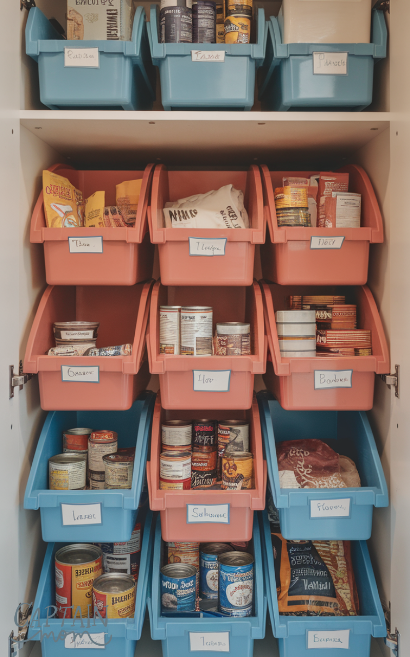 Stackable bins are ideal for maximizing cabinet and pantry kitchen storage. They allow you to use vertical space efficiently while keeping items grouped and easy to access. This system works well for snacks, canned goods, or baking supplies.