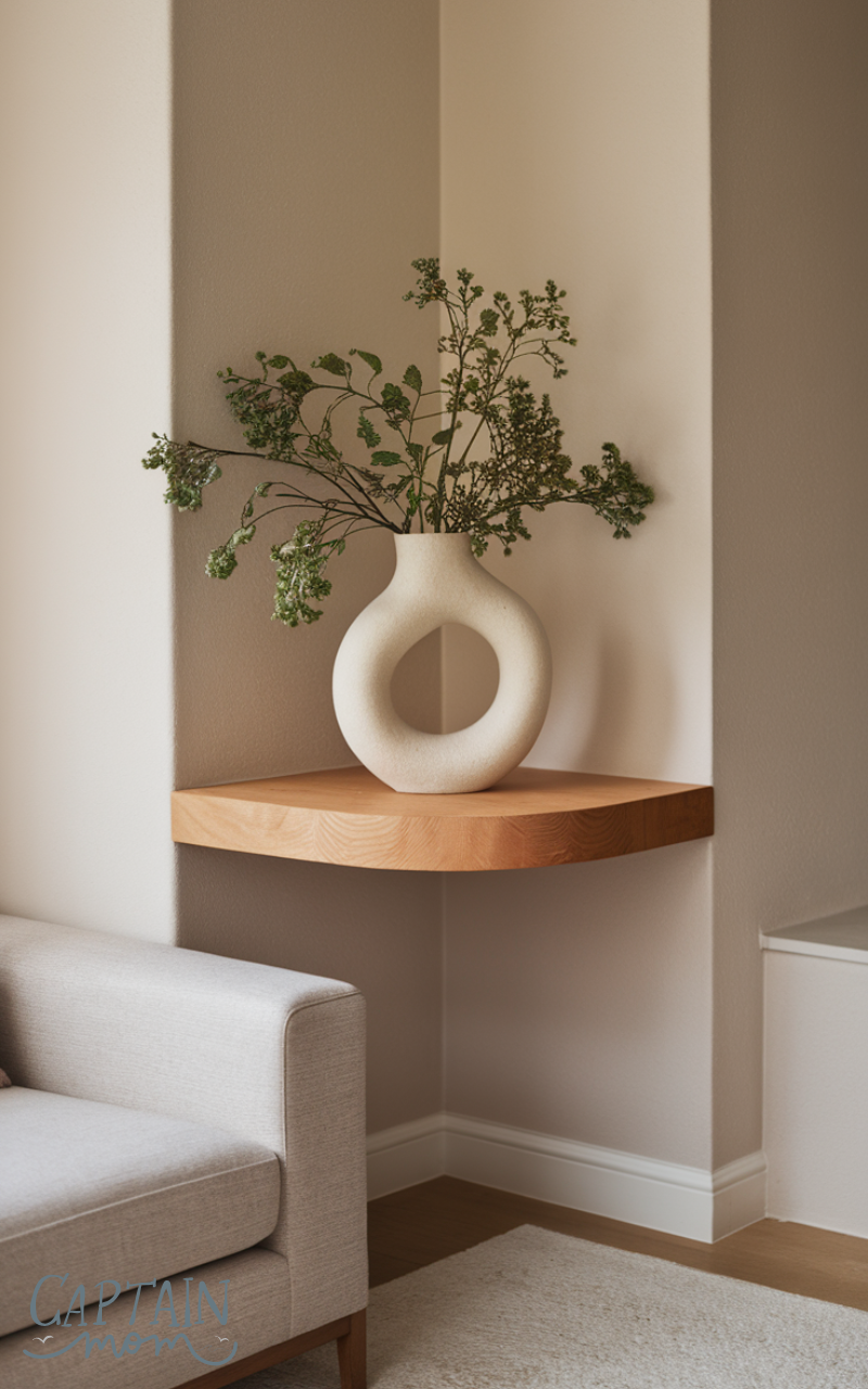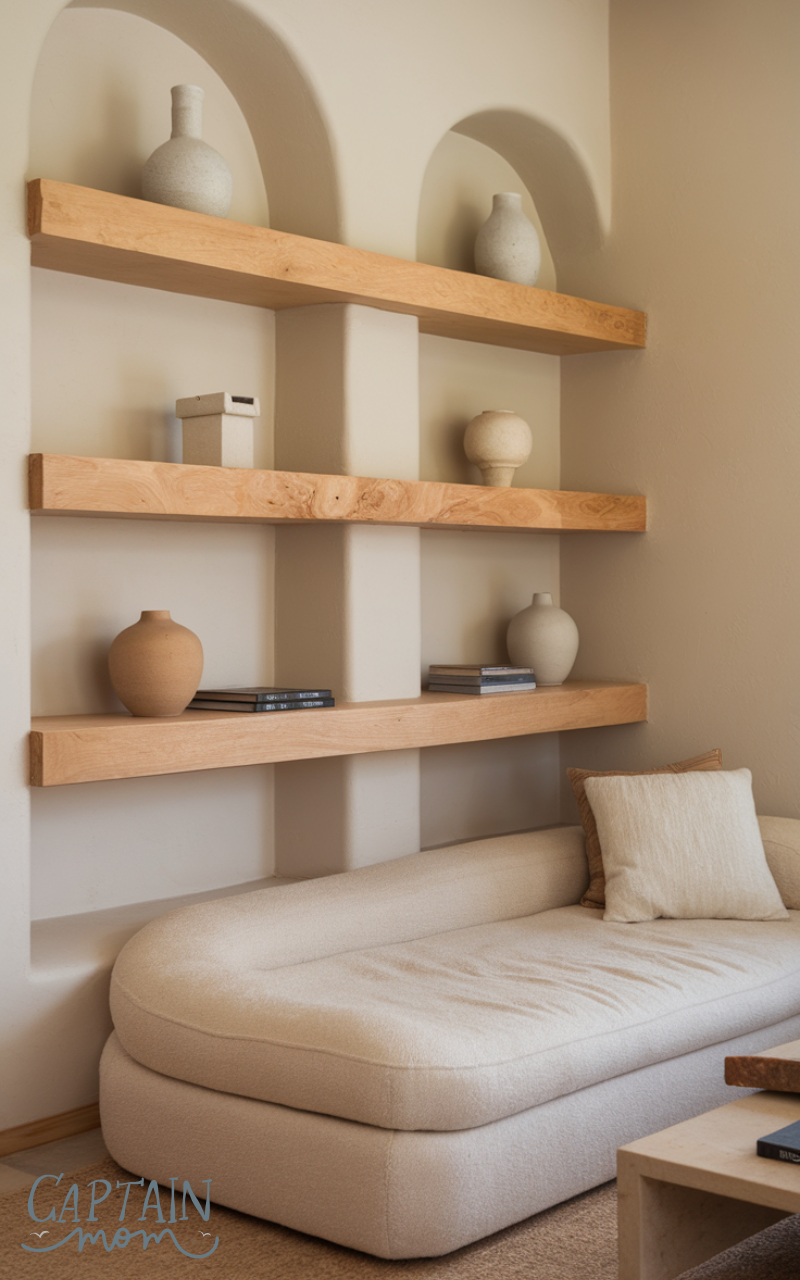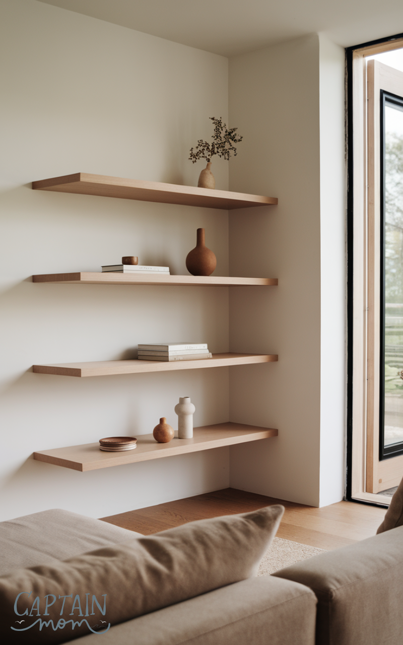 Natural wood shelves paired with ceramic vases or neutral pottery are perfect for minimal floating shelves living room decor. This combination brings warmth and texture while maintaining a clean, relaxed atmosphere.