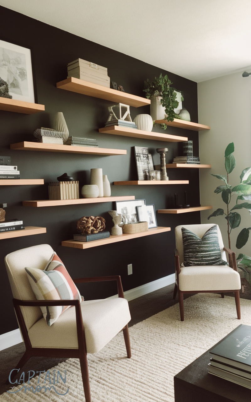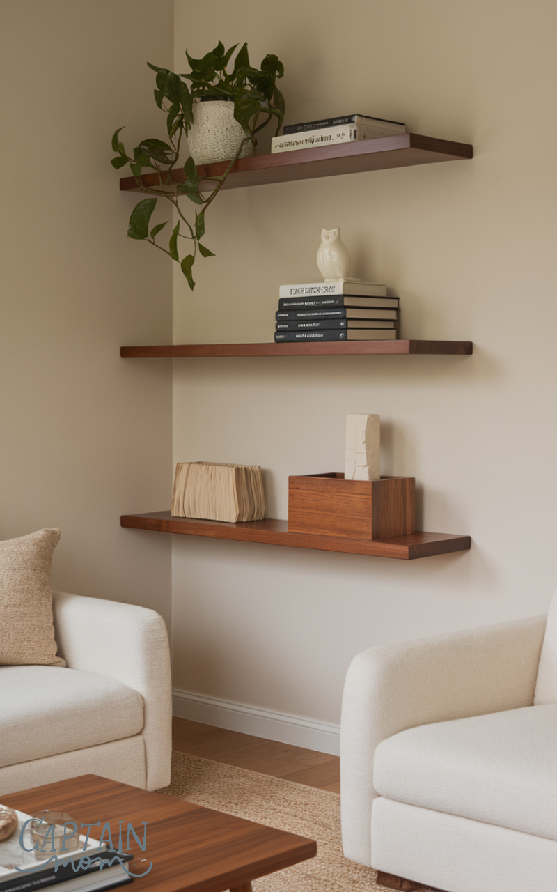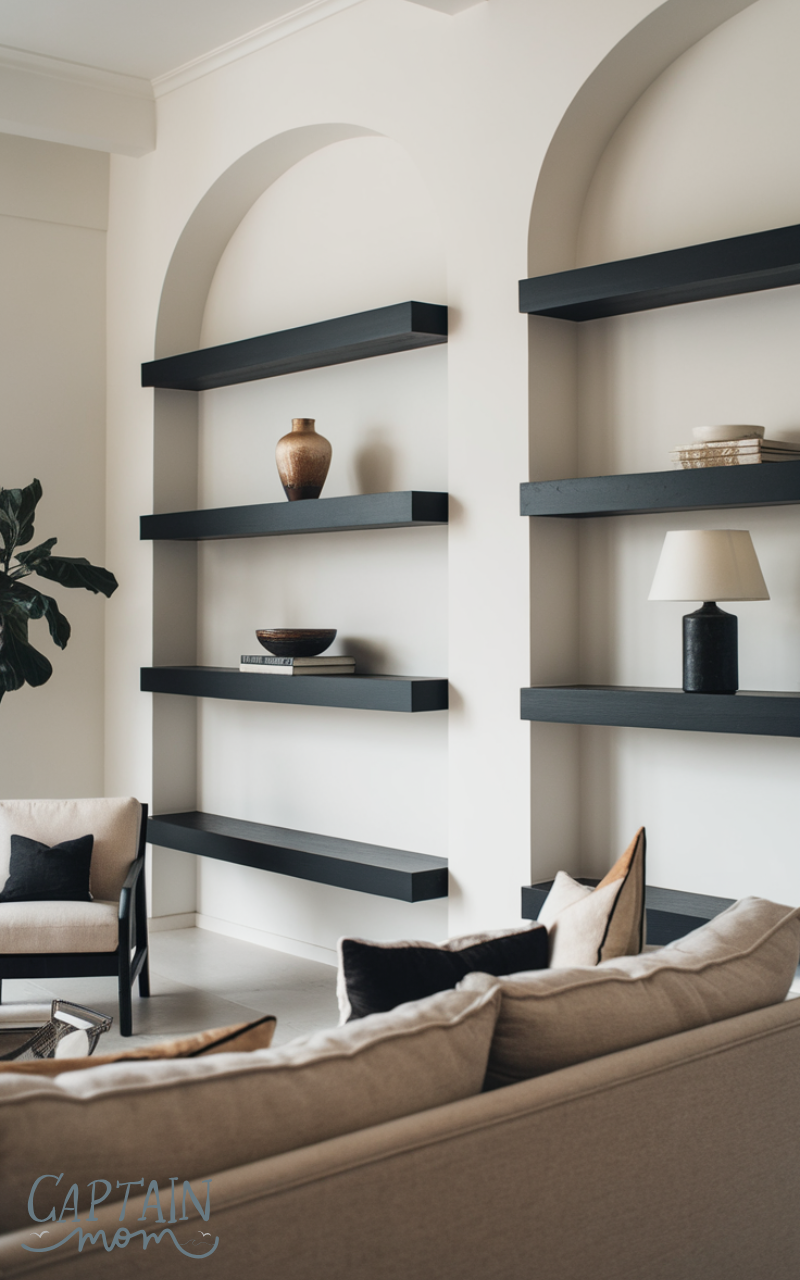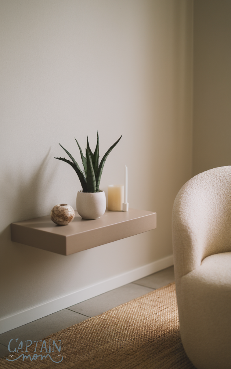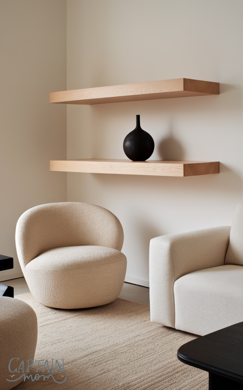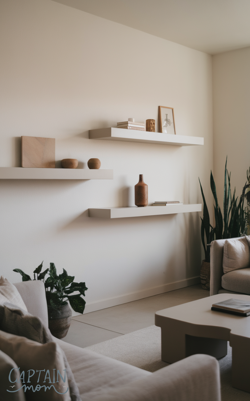 The most important rule of minimal floating shelves living room decor is leaving space empty. Negative space allows each item to breathe and keeps the living room feeling open, calm, and modern.