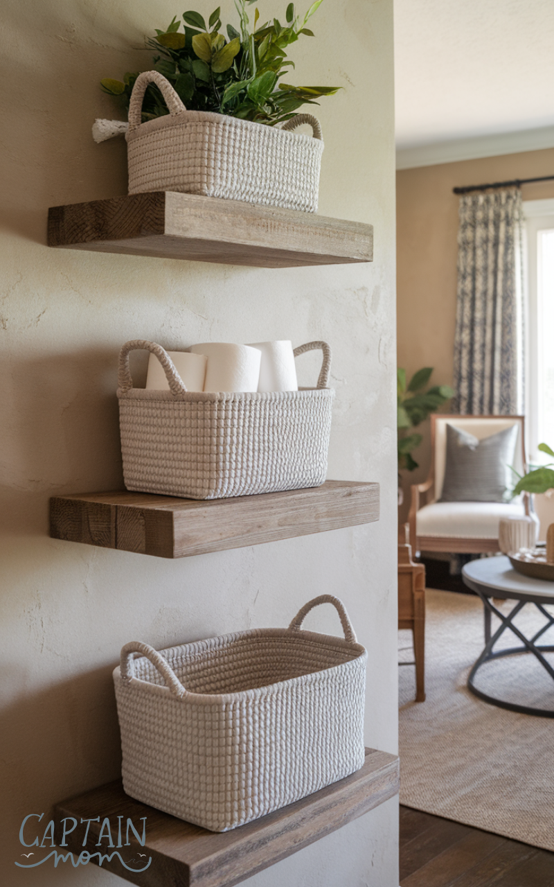 Using a few neutral baskets on floating shelves offers storage without clutter. This practical approach fits perfectly with minimal floating shelves living room decor while keeping everyday items hidden.