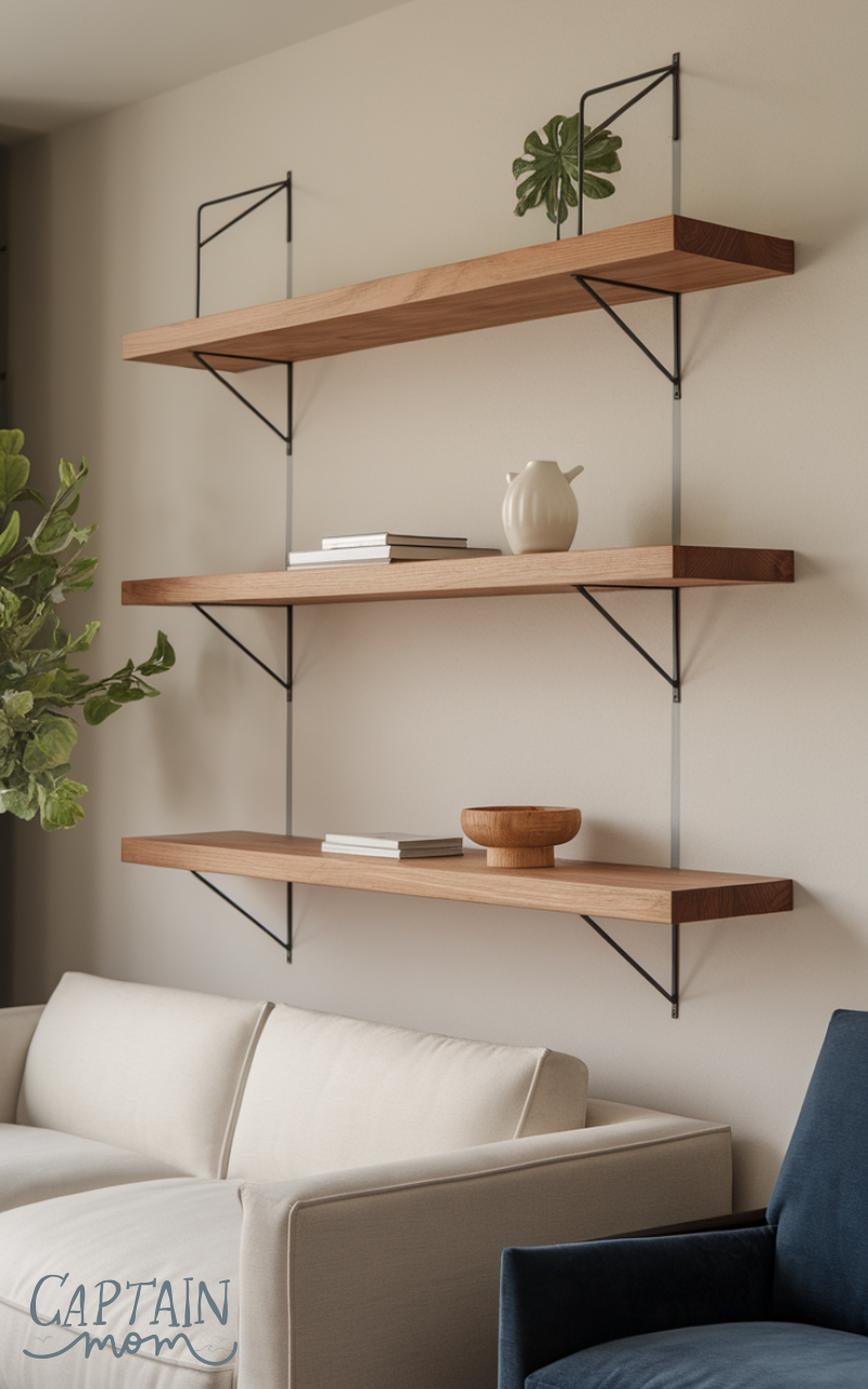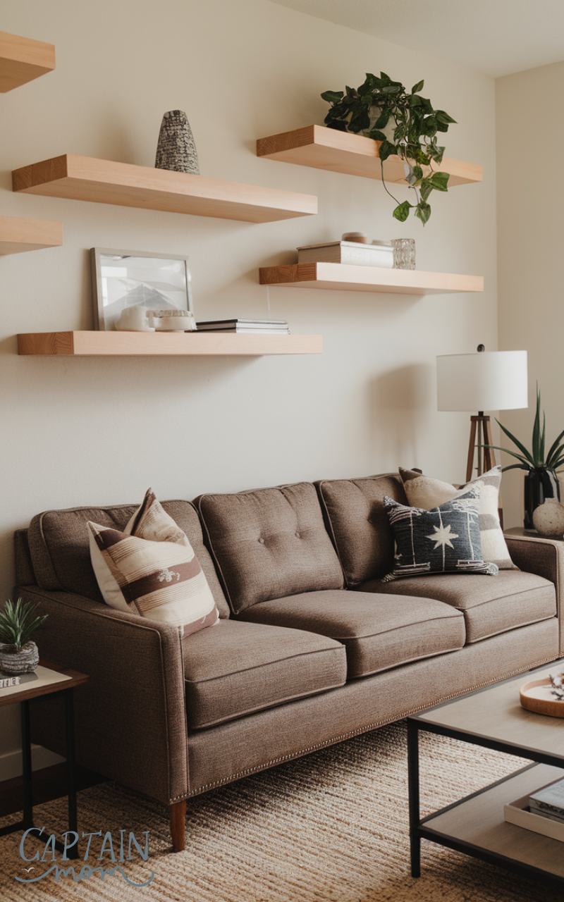 Installing floating shelves above the sofa is both practical and stylish. For minimal floating shelves living room decor, keep decor light, balanced, and evenly spaced to avoid overpowering the seating area.