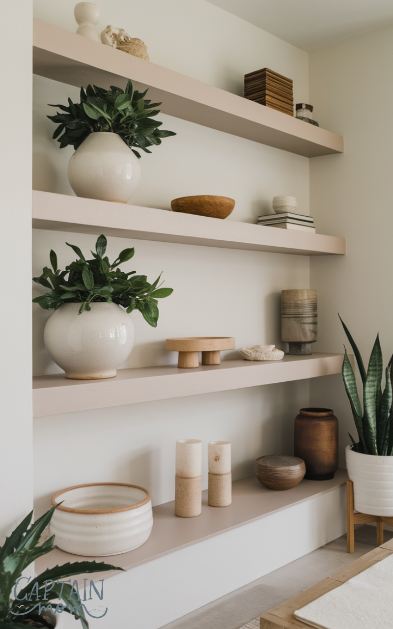 Using decor items in the same color family keeps shelves cohesive. This tone-on-tone approach is a refined way to achieve minimal floating shelves living room decor that looks curated and peaceful.