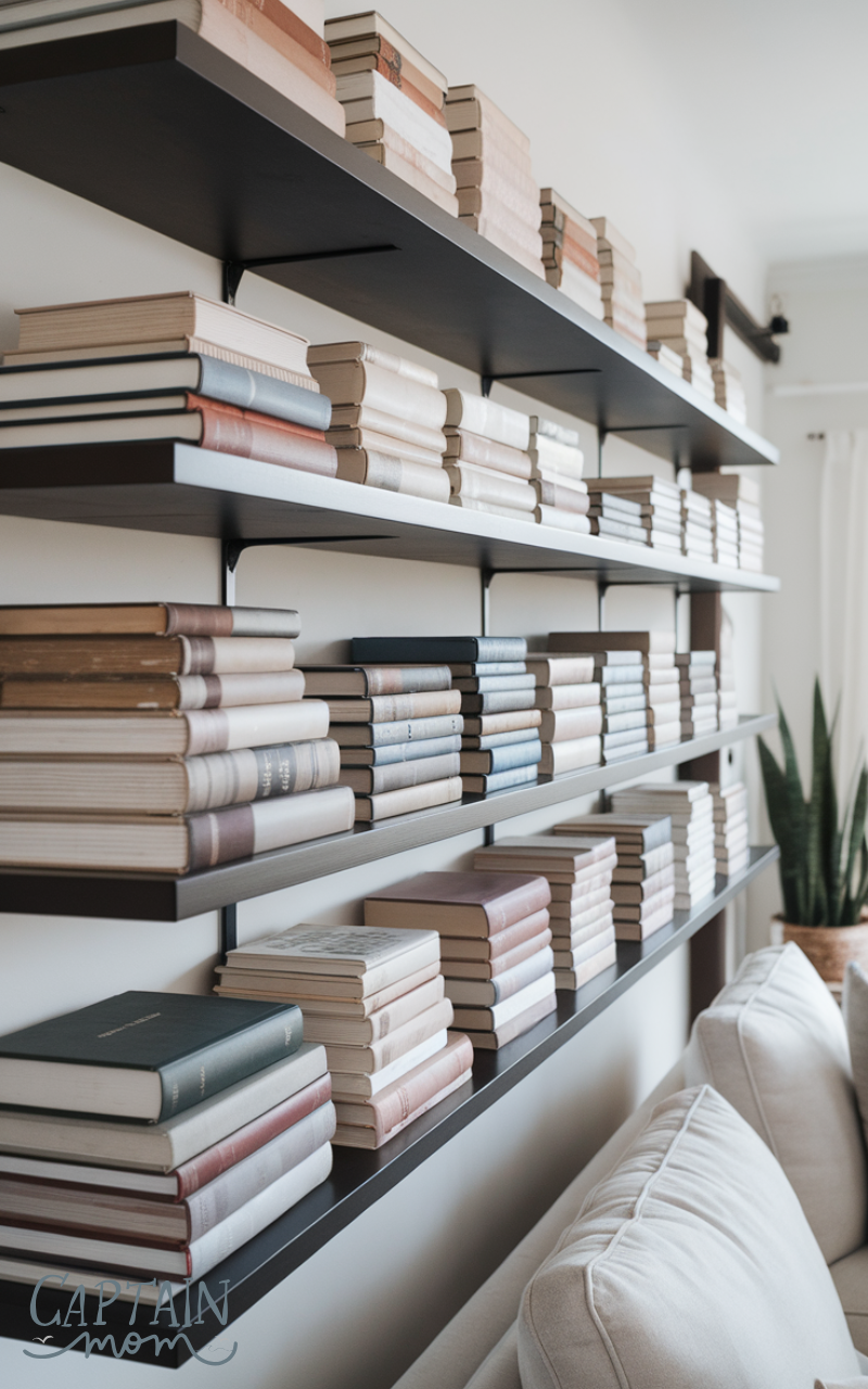 Stacking books horizontally creates visual calm. This technique works beautifully in minimal floating shelves living room decor, especially when book covers are neutral or similar in tone.