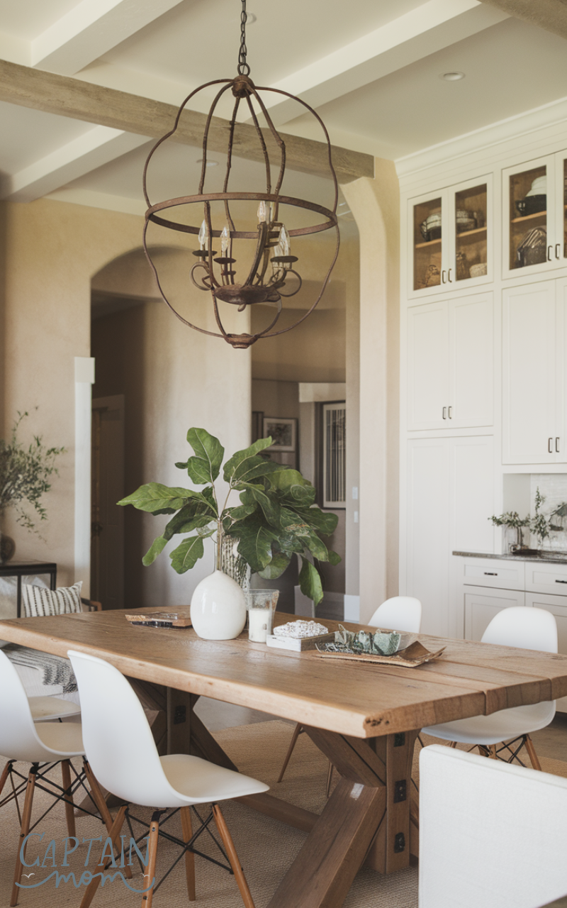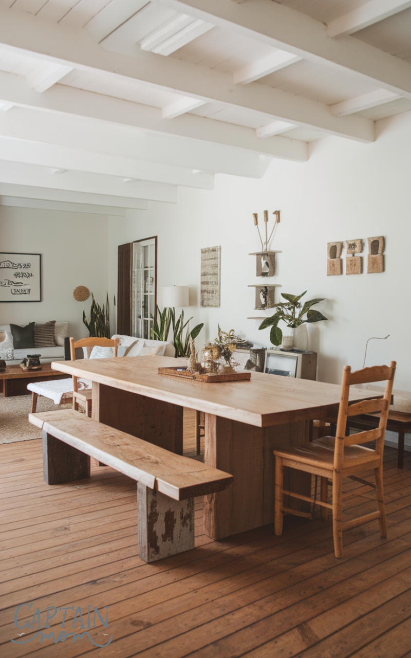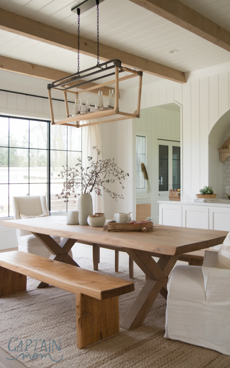 A large wooden dining table is essential in modern farmhouse home decor. Pair it with mixed chairs or benches to create a welcoming, communal space. Natural wood tones combined with neutral decor elements make meals feel cozy, casual, and stylish.
