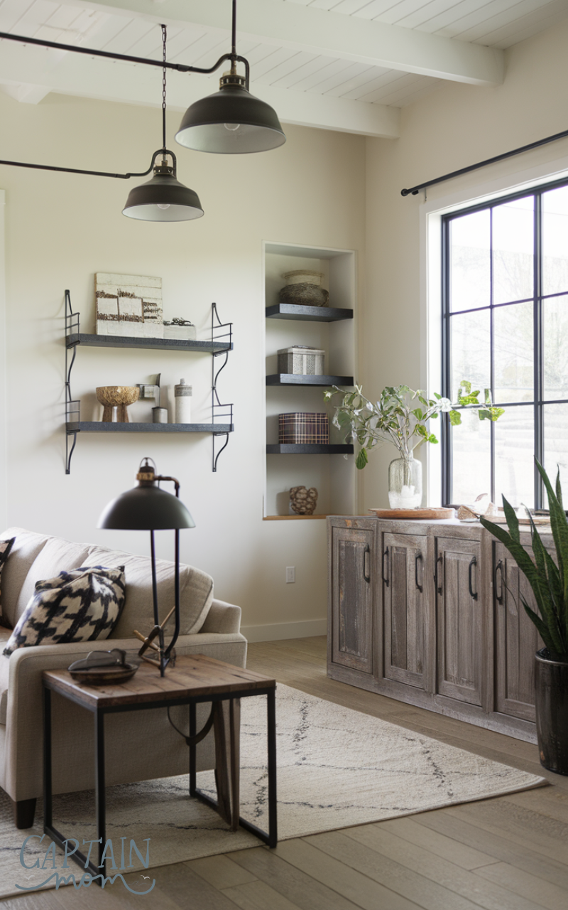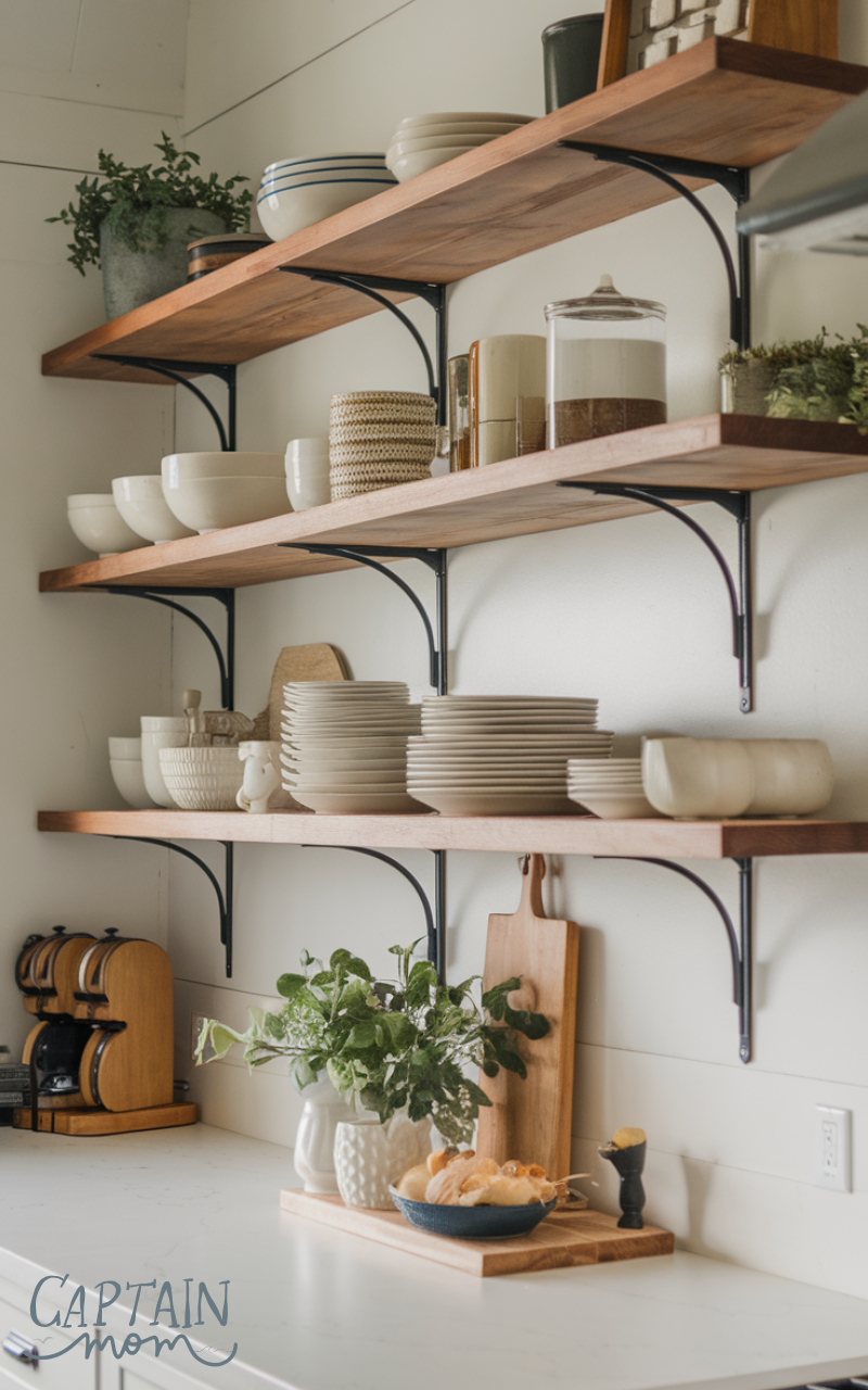 Open shelving is a functional and decorative modern farmhouse home decor trick. It showcases dishware, decor items, and small plants while keeping spaces airy. Wooden shelves paired with metal brackets enhance the rustic charm and make your home feel open and welcoming.