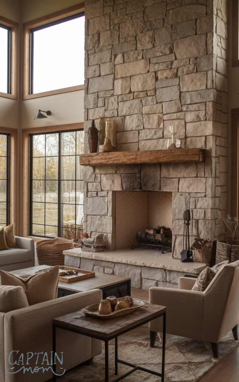 A fireplace adds warmth and charm to modern farmhouse home decor. Whether traditional wood-burning or electric, surround it with rustic wood or stone accents. A fireplace becomes a focal point in your living room, perfect for cozy nights and family gatherings.