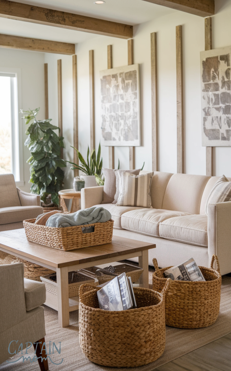Woven baskets are practical and stylish in modern farmhouse home decor. Use them to store blankets, magazines, or everyday essentials. Baskets add texture, warmth, and an organic element while keeping your home organized and clutter-free.