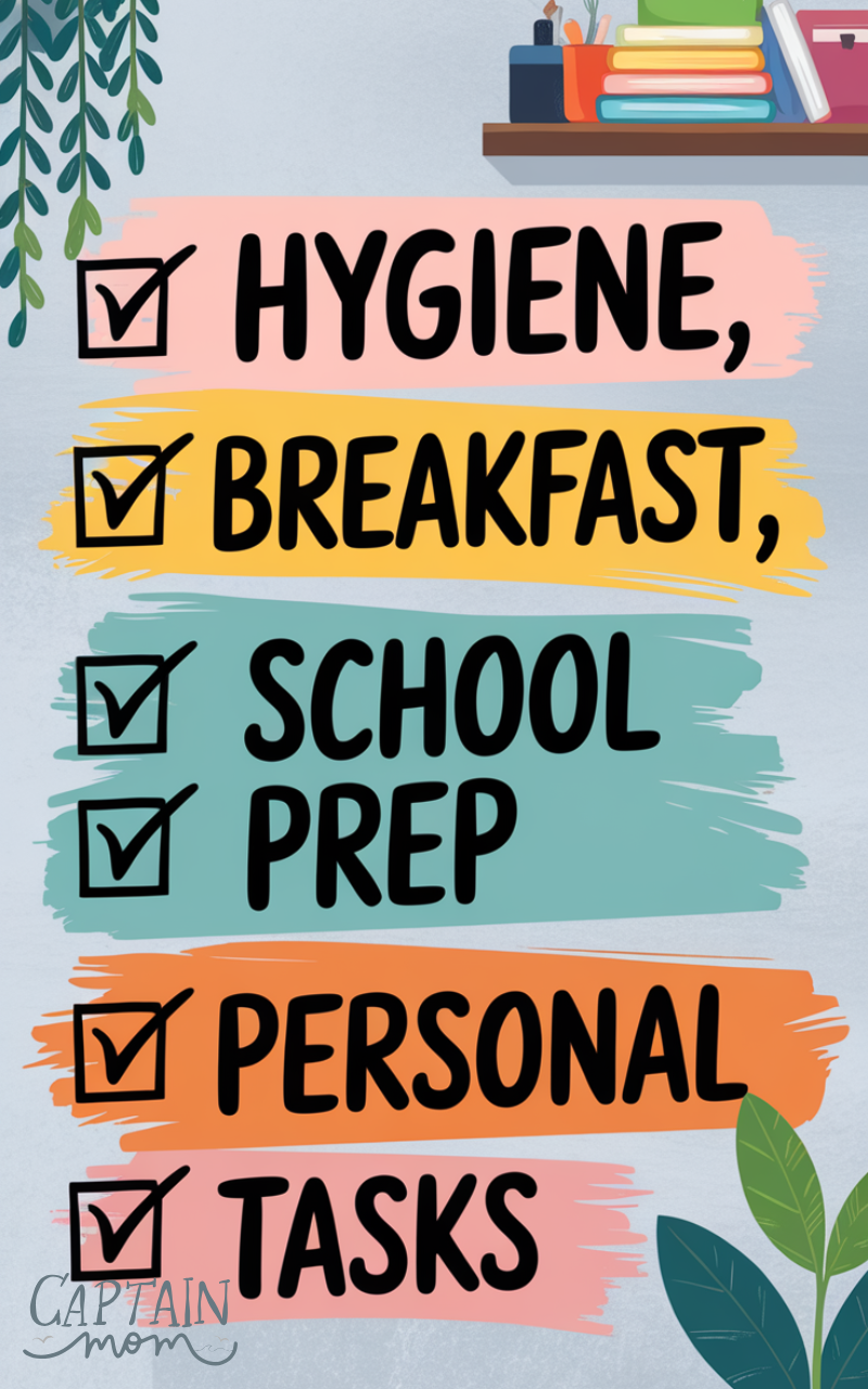A checklist keeps moms organized and ensures nothing is forgotten. Include hygiene, breakfast, school prep, and personal tasks. This visual tool simplifies the morning routine for moms and provides a sense of accomplishment as tasks are checked off.