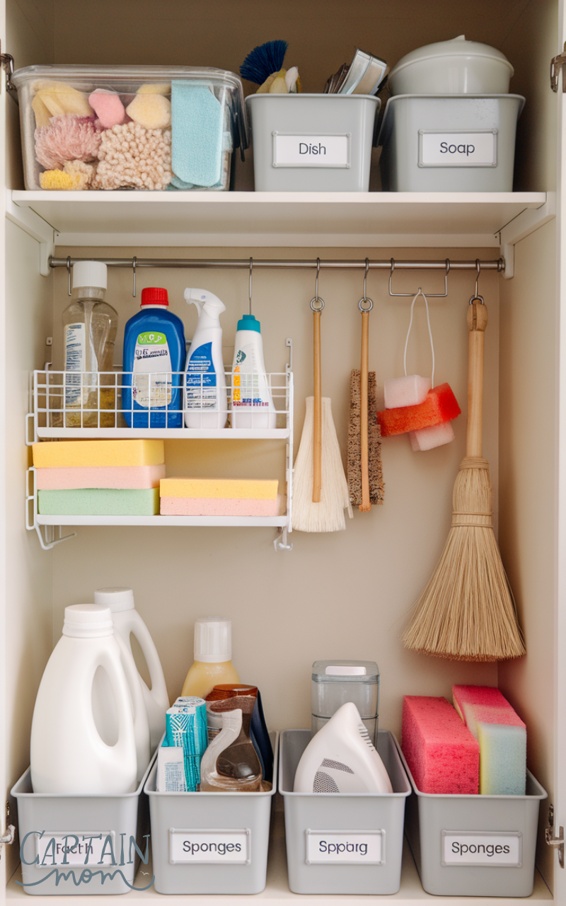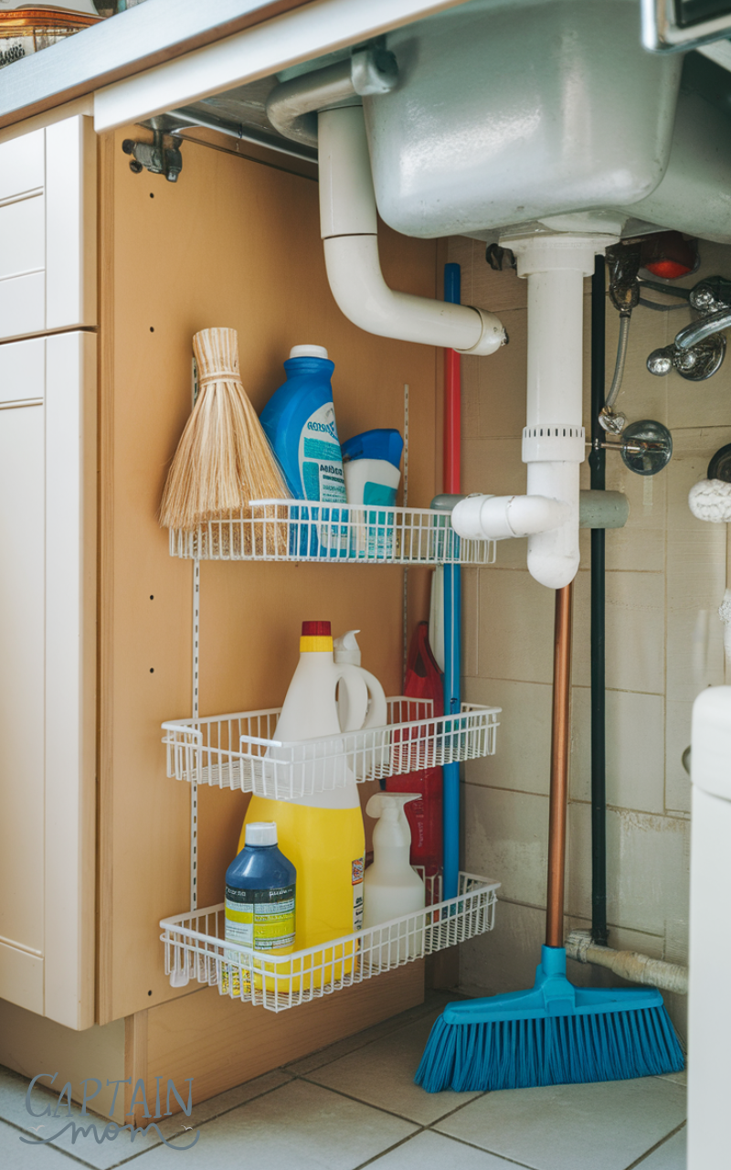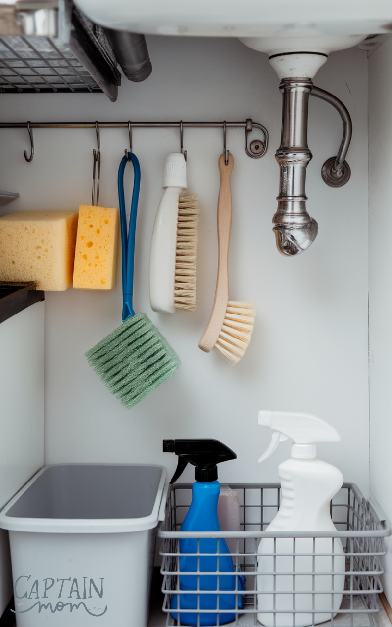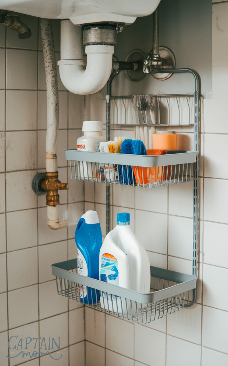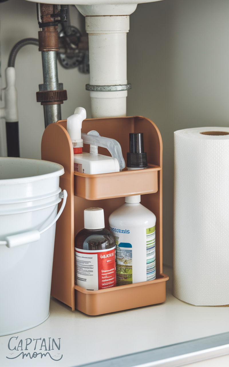Keeping categories separate is key. This simple under sink kitchen storage idea prevents overcrowding and makes daily cleaning routines faster and more efficient.