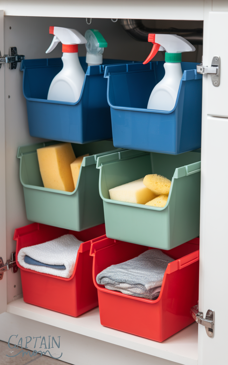 Stackable plastic bins are one of the most simple under sink kitchen storage ideas for organizing cleaning supplies. They create clear zones for sprays, sponges, and cloths while making it easy to pull items out without disturbing everything else.