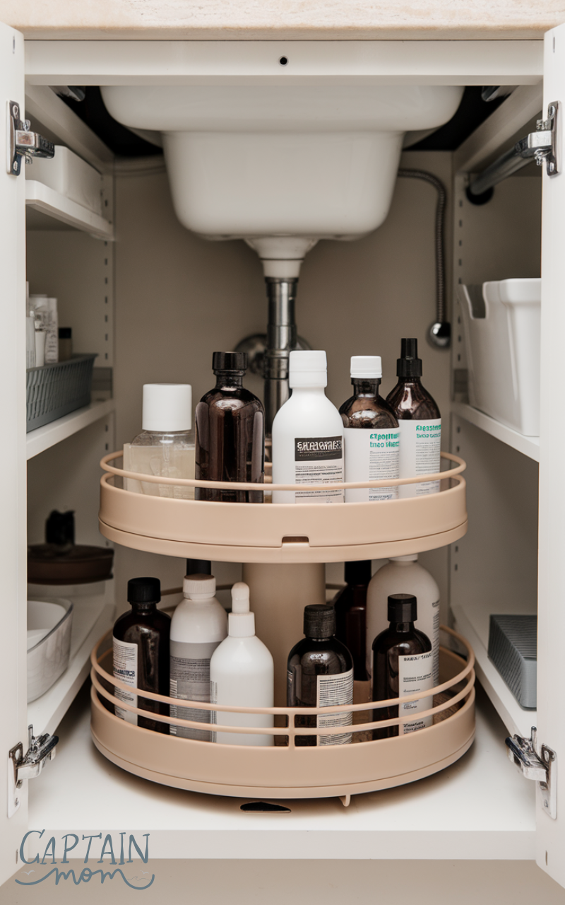 A rotating tray helps you access bottles easily. This simple under sink kitchen storage idea is especially useful in narrow cabinets where reaching the back can be difficult.